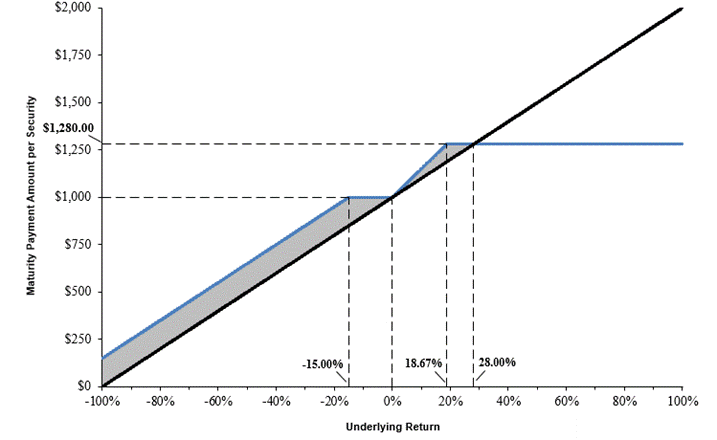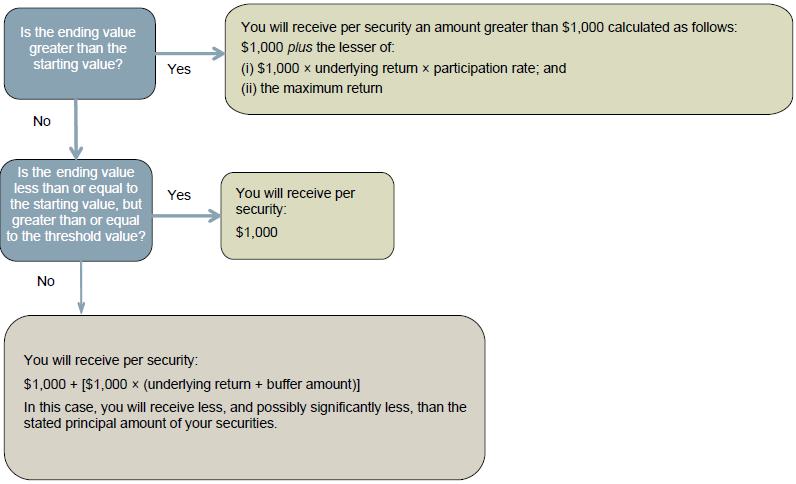 | Maturity Payment Amount: | For each $1,000 stated principal amount security you hold at maturity: • If the ending value is greater than the starting value: $1,000 plus the lesser of: (i) $1,000 × underlying return × participation rate; and (ii) the maximum return • If the ending value is less than or equal to the starting value, but greater than or equal to the threshold value: $1,000; or • If the ending value is less than the threshold value: $1,000 + [$1,000 × (underlying return + buffer amount)] If the ending value is less than the threshold value, you will have 1-to-1 downside exposure to the decrease in the value of the underlying in excess of the buffer amount and will lose some, and possibly up to 85%, of the stated principal amount of your securities at maturity. |