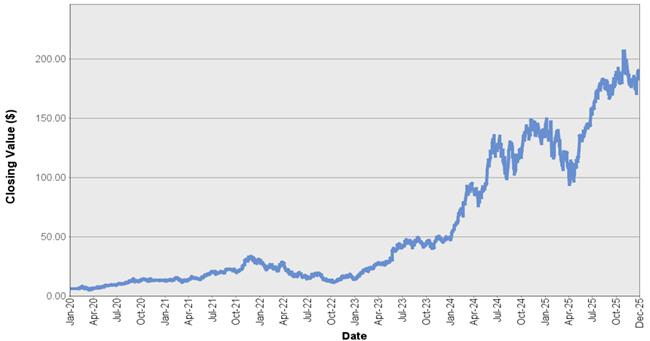 The graph below shows the closing value of NVIDIA Corporation for each day such value was available from January 2, 2020 to December 29, 2025. We obtained the closing values from Bloomberg L.P., without independent verification. If certain corporate transactions occurred during the historical period shown below, including, but not limited to, spin-offs or mergers, then the closing values shown below for the period prior to the occurrence of any such transaction have been adjusted by Bloomberg L.P. as if any such transaction had occurred prior to the first day in the period shown below. You should not take historical closing values as an indication of future performance.