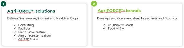 Our two divisions—AgriFORCE Solutions and AgriFORCE Brands—work in partnership to address some of the existential challenges being faced by the world today—climate change, extreme weather, food security and sovereignty, the environmental impact of industrial and commercial farming—working towards providing better tasting, more nutritious plant-based foods and other products to consumers on a global level.
