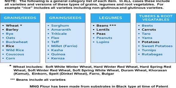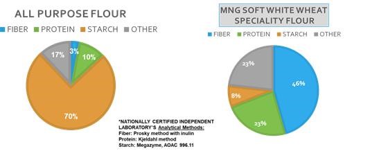 MNG Wheat flour has 30 times more fibers, up to 3 times more proteins and less than 15% of the starch as Regular All-Purpose Baking flour as independently tested and conducted by Eurofins Food Chemistry Testing Madison, Inc.