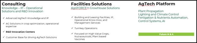AgriFORCE Solutions provides consulting services for AgTech knowledge, operational solutions, and research and development (R&D), which is augmented with patented and patent pending controlled-environment agriculture (CEA) and additional agriculture facilities and platforms.