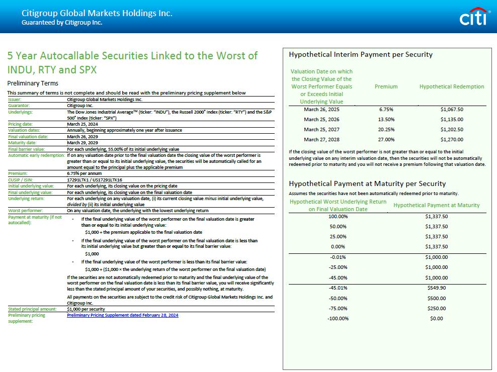 Citigroup Global Markets Holdings Inc. Guaranteed by Citigroup Inc. 5 Year Autocallable Securities Linked to the Worst of INDU, RTY and SPX Preliminary Terms This summary of terms is not complete and should be read with the preliminary pricing supplement below Issuer: Citigroup Global Markets Holdings Inc. Guarantor: Citigroup Inc. Underlyings: The Dow Jones Industrial Average TM (ticker: “INDU”), the Russell 2000 ® Index (ticker: “RTY”) and the S&P 500 ® Index (ticker: “SPX”) Pricing date: March 25, 2024 Valuation dates: Annually, beginning approximately one year after issuance Final valuation date: March 26, 2029 Maturity date: March 29, 2029 Final barrier value: For each underlying, 55.00% of its initial underlying value Automatic early redemption: If on any valuation date prior to the final valuation date the closing value of the worst performer is greater than or equal to its initial underlying value, the securities will be automatically called for an amount equal to the principal plus the applicable premium Premium: 6.75% per annum CUSIP / ISIN: 17291LTK1 / US17291LTK16 Initial underlying value: For each underlying, its closing value on the pricing date Final underlying value: For each underlying, its closing value on the final valuation date Underlying return: For each underlying on any valuation date, (i) its current closing value minus initial underlying value, divided by (ii) its initial underlying value Worst performer: On any valuation date, the underlying with the lowest underlying return Payment at maturity (if not autocalled): • If the final underlying value of the worst performer on the final valuation date is greater than or equal to its initial underlying value: $1,000 + the premium applicable to the final valuation date • If the final underlying value of the worst performer on the final valuation date is less than its initial underlying value but greater than or equal to its final barrier value: $1,000 • If the final underlying value of the worst performer is less than its final barrier value: $1,000 + ($1,000 п the underlying return of the worst performer on the final valuation date) If the securities are not automatically redeemed prior to maturity and the final underlying value of the worst performer on the final valuation date is less than its final barrier value, you will receive significantly less than the stated principal amount of your securities, and possibly nothing, at maturity. All payments on the securities are subject to the credit risk of Citigroup Global Markets Holdings Inc. and Citigroup Inc. Stated principal amount: $1,000 per security Preliminary pricing supplement: Preliminary Pricing Supplement dated February 28, 2024 Hypothetical Interim Payment per Security Valuation Date on which the Closing Value of the Worst Performer Equals or Exceeds Initial Underlying Value Premium March 26, 2025 March 25, 2026 13.50% March 25, 2027 20.25% March 27, 2028 27.00% If the closing value of the worst performer is not greater than or equal to the initial underlying value on any interim valuation date, then the securities will not be automatically redeemed prior to maturity and you will not receive a premium following that valuation date. Hypothetical Payment at Maturity per Security Assumes the securities have not been automatically redeemed prior to maturity. Hypothetical Worst Underlying Return on Final Valuation Date Hypothetical Payment at Maturity 100.00% $1,337.50 50.00% $1,337.50 25.00% $1,337.50 0.00% $1,337.50 - 0.01% $1,000.00 - 25.00% $1,000.00 - 45.00% $1,000.00 - 45.01% $549.90 - 50.00% $500.00 - 75.00% $250.00 - 100.00% $0.00