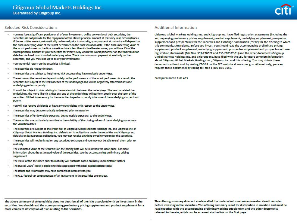 Citigroup Global Markets Holdings Inc. Guaranteed by Citigroup Inc. Selected Risk Considerations • You may lose a significant portion or all of your investment. Unlike conventional debt securities, the securities do not provide for the repayment of the stated principal amount at maturity in all circumstances. If the securities are not automatically redeemed prior to maturity, your payment at maturity will depend on the final underlying value of the worst performer on the final valuation date. If the final underlying value of the worst performer on the final valuation date is less than its final barrier value, you will lose 1% of the stated principal amount of your securities for every 1% by which the worst performer on the final valuation date has declined from its initial underlying value. There is no minimum payment at maturity on the securities, and you may lose up to all of your investment. • Your potential return on the securities is limited. • The securities do not pay interest. • The securities are subject to heightened risk because they have multiple underlyings. • The return on the securities depends solely on the performance of the worst performer. As a result, the securities are subject to the risks of each of the underlyings and will be negatively affected if any one underlying performs poorly. • You will be subject to risks relating to the relationship between the underlyings. The less correlated the underlyings, the more likely it is that any one of the underlyings will perform poorly over the term of the securities. All that is necessary for the securities to perform poorly is for one of the underlyings to perform poorly. • You will not receive dividends or have any other rights with respect to the underlyings. • The securities may be automatically redeemed prior to maturity. • The securities offer downside exposure, but no upside exposure, to the underlyings. • The securities are particularly sensitive to the volatility of the closing values of the underlyings on or near the valuation dates . • The securities are subject to the credit risk of Citigroup Global Markets Holdings Inc . and Citigroup Inc . If Citigroup Global Markets Holdings Inc . defaults on its obligations under the securities and Citigroup Inc . defaults on its guarantee obligations, you may not receive anything owed to you under the securities . • The securities will not be listed on any securities exchange and you may not be able to sell them prior to maturity . • The estimated value of the securities on the pricing date will be less than the issue price . For more information about the estimated value of the securities, see the accompanying preliminary pricing supplement . • The value of the securities prior to maturity will fluctuate based on many unpredictable factors . • The Russell 2000 ® Index is subject to risks associated with small capitalization stocks . • The issuer and its affiliates may have conflicts of interest with you . • The U . S . federal tax consequences of an investment in the securities are unclear . The above summary of selected risks does not describe all of the risks associated with an investment in the securities. You should read the accompanying preliminary pricing supplement and product supplement for a more complete description of risks relating to the securities. Additional Information Citigroup Global Markets Holdings Inc. and Citigroup Inc. have filed registration statements (including the accompanying preliminary pricing supplement, product supplement, underlying supplement, prospectus supplement and prospectus) with the Securities and Exchange Commission (“SEC”) for the offering to which this communication relates. Before you invest, you should read the accompanying preliminary pricing supplement, product supplement, underlying supplement, prospectus supplement and prospectus in those registration statements (File Nos. 333 - 270327 and 333 - 270327 - 01) and the other documents Citigroup Global Markets Holdings Inc. and Citigroup Inc. have filed with the SEC for more complete information about Citigroup Global Markets Holdings Inc., Citigroup Inc. and this offering. You may obtain these documents without cost by visiting EDGAR on the SEC website at www.sec.gov. Alternatively, you can request these documents by calling toll - free 1 - 800 - 831 - 9146. Filed pursuant to Rule 433 This offering summary does not contain all of the material information an investor should consider before investing in the securities. This offering summary is not for distribution in isolation and must be read together with the accompanying preliminary pricing supplement and the other documents referred to therein, which can be accessed via the link on the first page.