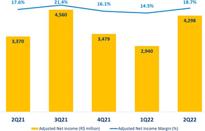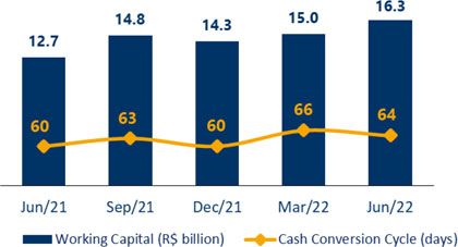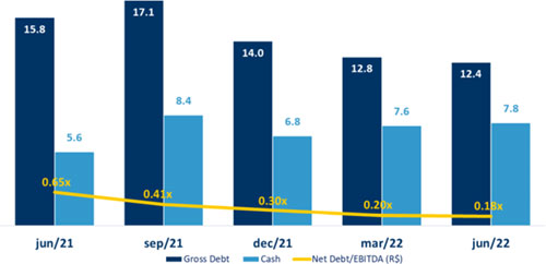 In this context, gross profit reached R$ 5.9 billion in 2Q22, increasing 14% from 1Q22 and 9% from 2Q21. Gross margin remained in line with 1Q22 and contracted 2.6 p.p. in relation to 2Q21.