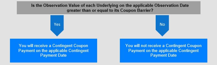 If, on any monthly Observation Date, the Observation Value of each Underlying is greater than or equal to its Coupon Barrier, we will pay a Contingent Coupon Payment of $8.125 per $1,000.00 in principal amount of Notes (equal to a rate of 0.8125% per month or 9.75% per annum) on the applicable Contingent Payment Date (including the Maturity Date). |