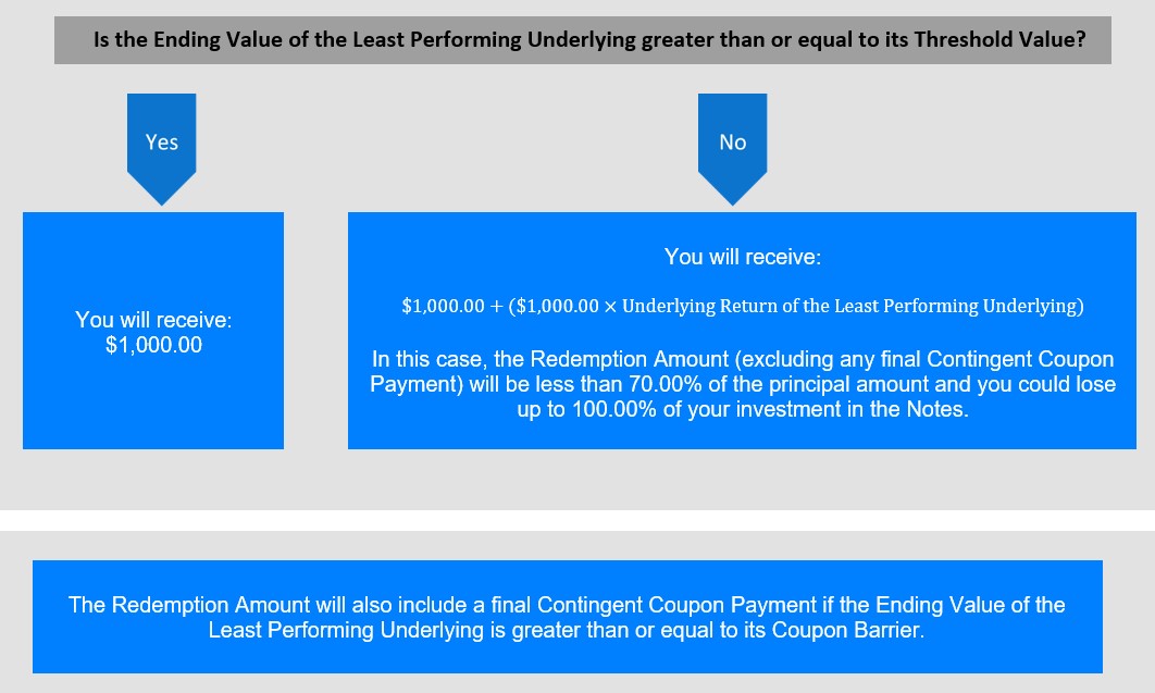 The Redemption Amount will also include a final Contingent Coupon Payment if the Ending Value of the Least Performing Underlying is greater than or equal to its Coupon Barrier. |