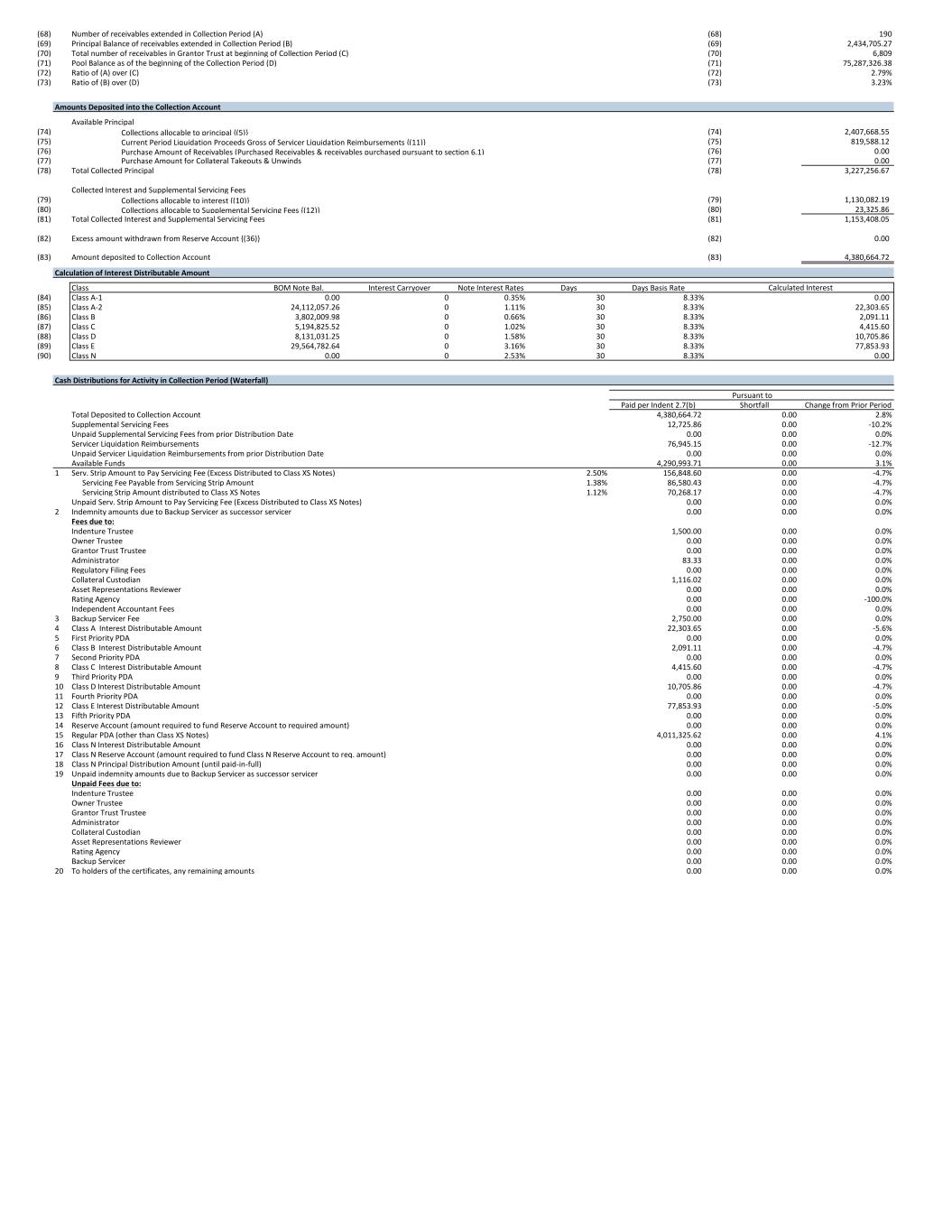 (68) Number of receivables extended in Collection Period (A) (68) 190 (69) Principal Balance of receivables extended in Collection Period (B) (69) 2,434,705.27 (70) Total number of receivables in Grantor Trust at beginning of Collection Period (C) (70) 6,809 (71) Pool Balance as of the beginning of the Collection Period (D) (71) 75,287,326.38 (72) Ratio of (A) over (C) (72) 2.79% (73) Ratio of (B) over (D) (73) 3.23% Amounts Deposited into the Collection Account Available Principal (74) Collections allocable to principal {(5)} (74) 2,407,668.55 (75) Current Period Liquidation Proceeds Gross of Servicer Liquidation Reimbursements {(11)} (75) 819,588.12 (76) Purchase Amount of Receivables (Purchased Receivables & receivables purchased pursuant to section 6.1) (76) 0.00 (77) Purchase Amount for Collateral Takeouts & Unwinds (77) 0.00 (78) Total Collected Principal (78) 3,227,256.67 Collected Interest and Supplemental Servicing Fees (79) Collections allocable to interest {(10)} (79) 1,130,082.19 (80) Collections allocable to Supplemental Servicing Fees {(12)} (80) 23,325.86 (81) Total Collected Interest and Supplemental Servicing Fees (81) 1,153,408.05 (82) Excess amount withdrawn from Reserve Account {(36)} (82) 0.00 (83) Amount deposited to Collection Account (83) 4,380,664.72 Calculation of Interest Distributable Amount Class BOM Note Bal. Interest Carryover Note Interest Rates Days Days Basis Rate Calculated Interest (84) Class A-1 0.00 0 0.35% 30 8.33% 0.00 (85) Class A-2 24,112,057.26 0 1.11% 30 8.33% 22,303.65 (86) Class B 3,802,009.98 0 0.66% 30 8.33% 2,091.11 (87) Class C 5,194,825.52 0 1.02% 30 8.33% 4,415.60 (88) Class D 8,131,031.25 0 1.58% 30 8.33% 10,705.86 (89) Class E 29,564,782.64 0 3.16% 30 8.33% 77,853.93 (90) Class N 0.00 0 2.53% 30 8.33% 0.00 Cash Distributions for Activity in Collection Period (Waterfall) Pursuant to Paid per Indent 2.7(b) Shortfall Change from Prior Period Total Deposited to Collection Account 4,380,664.72 0.00 2.8% Supplemental Servicing Fees 12,725.86 0.00 -10.2% Unpaid Supplemental Servicing Fees from prior Distribution Date 0.00 0.00 0.0% Servicer Liquidation Reimbursements 76,945.15 0.00 -12.7% Unpaid Servicer Liquidation Reimbursements from prior Distribution Date 0.00 0.00 0.0% Available Funds 4,290,993.71 0.00 3.1% 1 Serv. Strip Amount to Pay Servicing Fee (Excess Distributed to Class XS Notes) 2.50% 156,848.60 0.00 -4.7% Servicing Fee Payable from Servicing Strip Amount 1.38% 86,580.43 0.00 -4.7% Servicing Strip Amount distributed to Class XS Notes 1.12% 70,268.17 0.00 -4.7% Unpaid Serv. Strip Amount to Pay Servicing Fee (Excess Distributed to Class XS Notes) 0.00 0.00 0.0% 2 Indemnity amounts due to Backup Servicer as successor servicer 0.00 0.00 0.0% Fees due to: Indenture Trustee 1,500.00 0.00 0.0% Owner Trustee 0.00 0.00 0.0% Grantor Trust Trustee 0.00 0.00 0.0% Administrator 83.33 0.00 0.0% Regulatory Filing Fees 0.00 0.00 0.0% Collateral Custodian 1,116.02 0.00 0.0% Asset Representations Reviewer 0.00 0.00 0.0% Rating Agency 0.00 0.00 -100.0% Independent Accountant Fees 0.00 0.00 0.0% 3 Backup Servicer Fee 2,750.00 0.00 0.0% 4 Class A Interest Distributable Amount 22,303.65 0.00 -5.6% 5 First Priority PDA 0.00 0.00 0.0% 6 Class B Interest Distributable Amount 2,091.11 0.00 -4.7% 7 Second Priority PDA 0.00 0.00 0.0% 8 Class C Interest Distributable Amount 4,415.60 0.00 -4.7% 9 Third Priority PDA 0.00 0.00 0.0% 10 Class D Interest Distributable Amount 10,705.86 0.00 -4.7% 11 Fourth Priority PDA 0.00 0.00 0.0% 12 Class E Interest Distributable Amount 77,853.93 0.00 -5.0% 13 Fifth Priority PDA 0.00 0.00 0.0% 14 Reserve Account (amount required to fund Reserve Account to required amount) 0.00 0.00 0.0% 15 Regular PDA (other than Class XS Notes) 4,011,325.62 0.00 4.1% 16 Class N Interest Distributable Amount 0.00 0.00 0.0% 17 Class N Reserve Account (amount required to fund Class N Reserve Account to req. amount) 0.00 0.00 0.0% 18 Class N Principal Distribution Amount (until paid-in-full) 0.00 0.00 0.0% 19 Unpaid indemnity amounts due to Backup Servicer as successor servicer 0.00 0.00 0.0% Unpaid Fees due to: Indenture Trustee 0.00 0.00 0.0% Owner Trustee 0.00 0.00 0.0% Grantor Trust Trustee 0.00 0.00 0.0% Administrator 0.00 0.00 0.0% Collateral Custodian 0.00 0.00 0.0% Asset Representations Reviewer 0.00 0.00 0.0% Rating Agency 0.00 0.00 0.0% Backup Servicer 0.00 0.00 0.0% 20 To holders of the certificates, any remaining amounts 0.00 0.00 0.0%