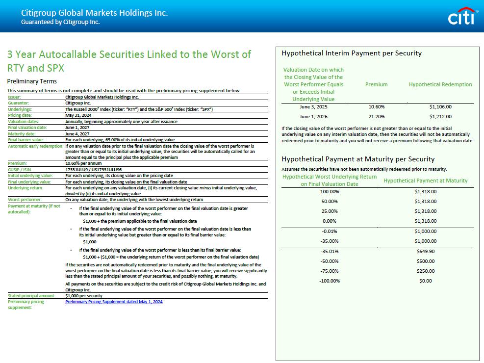 Citigroup Global Markets Holdings Inc. Guaranteed by Citigroup Inc. 3 Year Autocallable Securities Linked to the Worst of RTY and SPX Preliminary Terms This summary of terms is not complete and should be read with the preliminary pricing supplement below Citigroup Global Markets Holdings Inc. Issuer: Citigroup Inc. Guarantor: The Russell 2000 ® Index (ticker: “RTY”) and the S&P 500 ® Index (ticker: “SPX”) Underlyings: May 31, 2024 Pricing date: Annually, beginning approximately one year after issuance Valuation dates: June 1, 2027 Final valuation date: June 4, 2027 Maturity date: For each underlying, 65.00% of its initial underlying value Final barrier value: If on any valuation date prior to the final valuation date the closing value of the worst performer is greater than or equal to its initial underlying value, the securities will be automatically called for an amount equal to the principal plus the applicable premium Automatic early redemption: 10.60% per annum Premium: 17331ULU9 / US17331ULU96 CUSIP / ISIN: For each underlying, its closing value on the pricing date Initial underlying value: For each underlying, its closing value on the final valuation date Final underlying value: For each underlying on any valuation date, (i) its current closing value minus initial underlying value, divided by (ii) its initial underlying value Underlying return: On any valuation date, the underlying with the lowest underlying return Worst performer: • If the final underlying value of the worst performer on the final valuation date is greater than or equal to its initial underlying value: $1,000 + the premium applicable to the final valuation date • If the final underlying value of the worst performer on the final valuation date is less than its initial underlying value but greater than or equal to its final barrier value: $1,000 • If the final underlying value of the worst performer is less than its final barrier value: $1,000 + ($1,000 п the underlying return of the worst performer on the final valuation date) If the securities are not automatically redeemed prior to maturity and the final underlying value of the worst performer on the final valuation date is less than its final barrier value, you will receive significantly less than the stated principal amount of your securities, and possibly nothing, at maturity. All payments on the securities are subject to the credit risk of Citigroup Global Markets Holdings Inc. and Citigroup Inc. Payment at maturity (if not autocalled): $1,000 per security Stated principal amount: Preliminary Pricing Supplement dated May 1, 2024 Preliminary pricing supplement: Hypothetical Interim Payment per Security Premium Valuation Date on which the Closing Value of the Worst Performer Equals or Exceeds Initial Underlying Value 10.60% June 3, 2025 21.20% June 1, 2026 If the closing value of the worst performer is not greater than or equal to the initial underlying value on any interim valuation date, then the securities will not be automatically redeemed prior to maturity and you will not receive a premium following that valuation date. Hypothetical Payment at Maturity per Security Assumes the securities have not been automatically redeemed prior to maturity. Hypothetical Payment Hypothetical Worst Underlying Return on Final Valuation Date 100.00% 50.00% 25.00% 0.00% - 0.01% - 35.00% - 35.01% - 50.00% - 75.00% - 100.00%