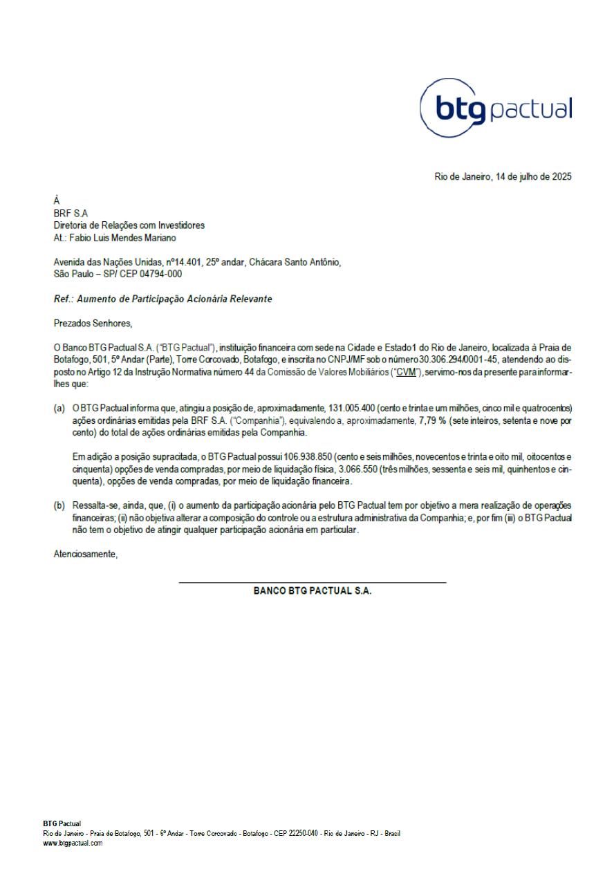 BRF S.A. (“BRF” or "Company") (B3: BRFS3; NYSE: BRFS), pursuant to article 12 of the CVM Instruction 44, as of August 23, 2021, announces to its shareholders and the market in general that it received, on July 14, 2025, a notice from Banco BTG Pactual S.A. (“BTG Pactual”) informing that it now, holds, approximately, 131,005,400 common shares issued by BRF, which represent, approximately, 7.79% of the Company’s capital stock. In addition to the above-mentioned position, BTG Pactual informed that it has 106,938,850 purchased put options, through physical settlement, and 3,066,550 purchased put options, through financial settlement.