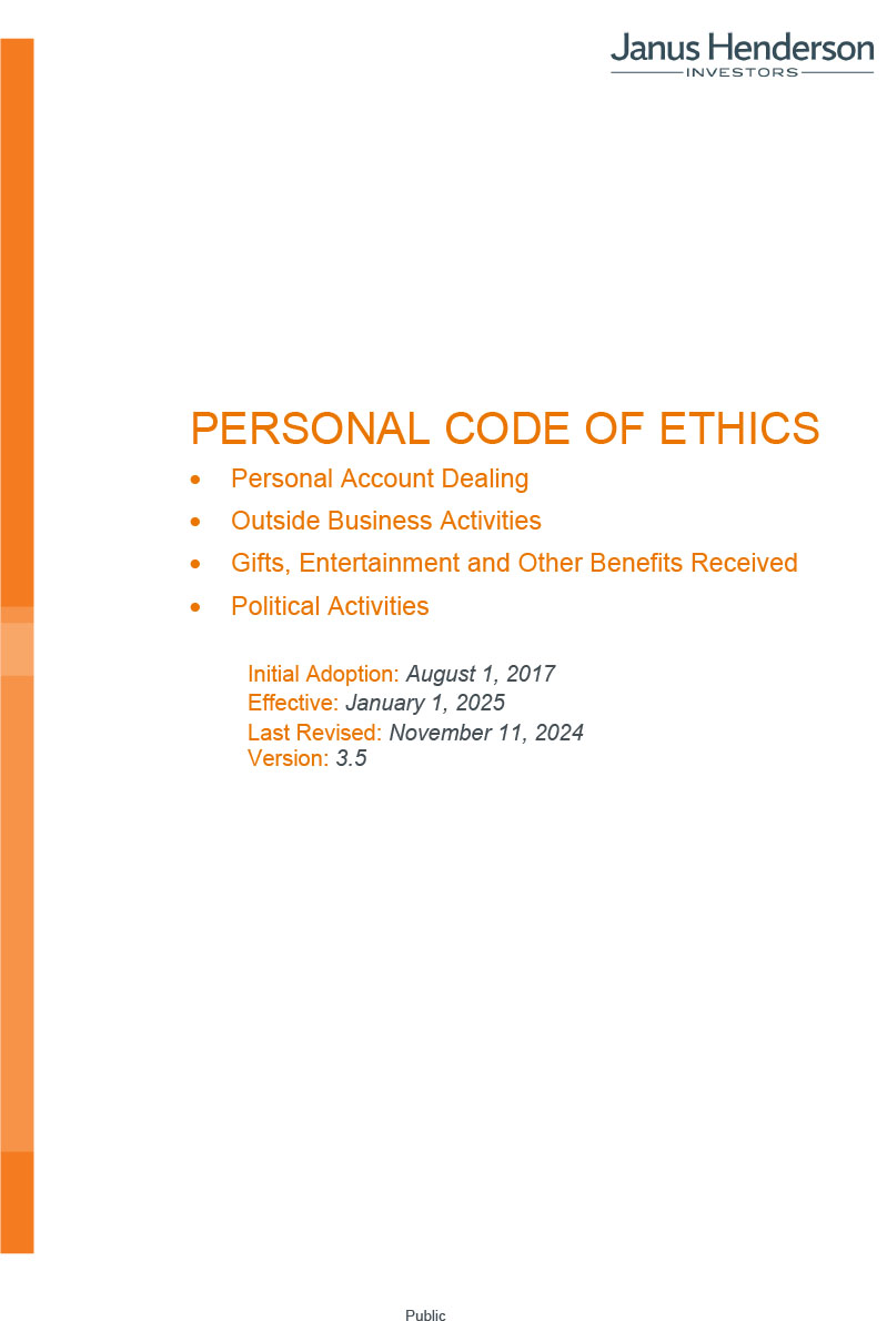 Janus Henderson is entrusted with the assets of our clients for investment purposes. As a result, we have an obligation to place our clients’ interests before our own and manage conflicts of interest fairly. The Personal Code of Ethics (the “Code”) provides a set of rules and principles to ensure that we meet that obligation when we engage in personal account dealing, conduct outside business activities, receive gifts, entertainment and other benefits, and participate in political activities.