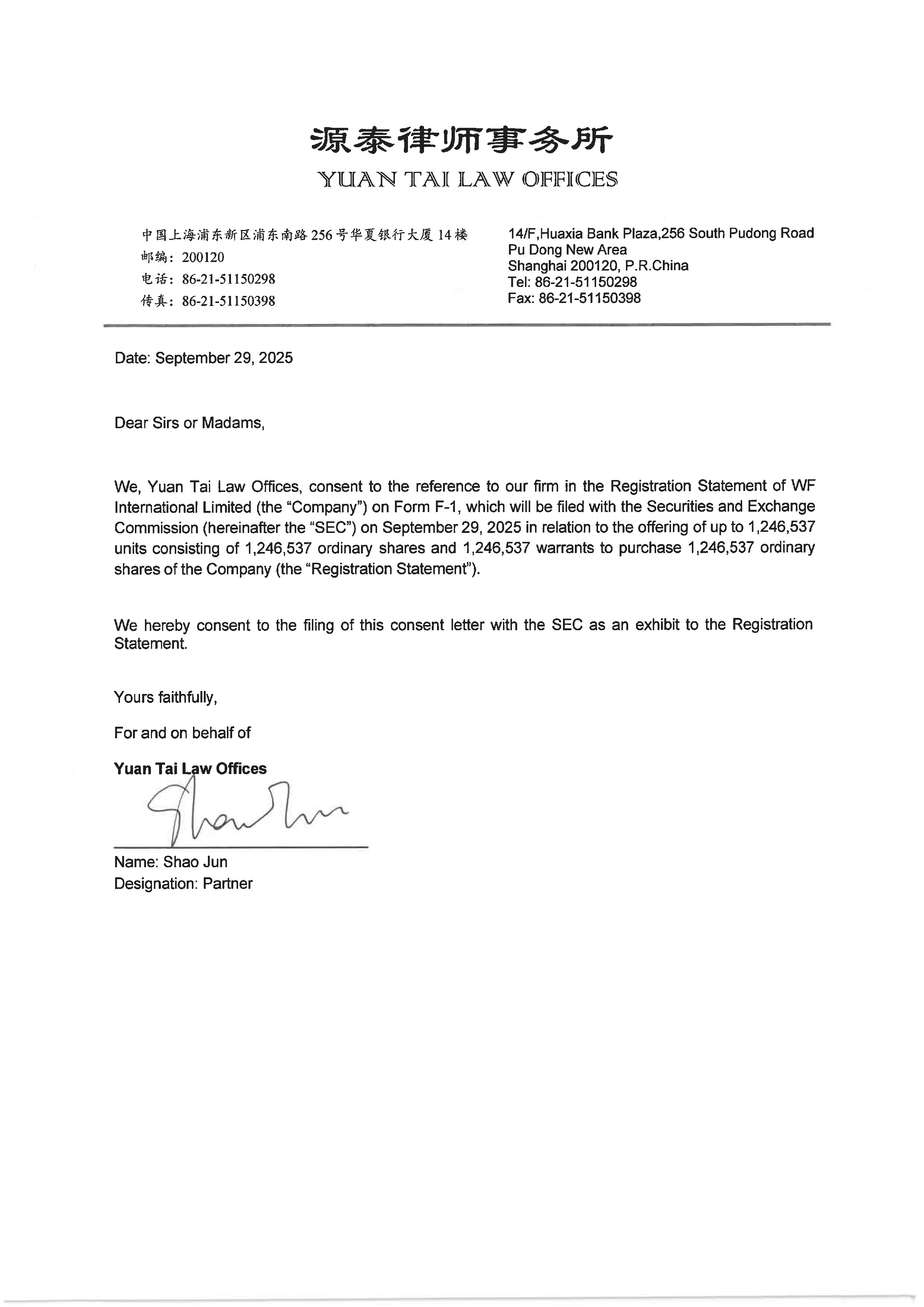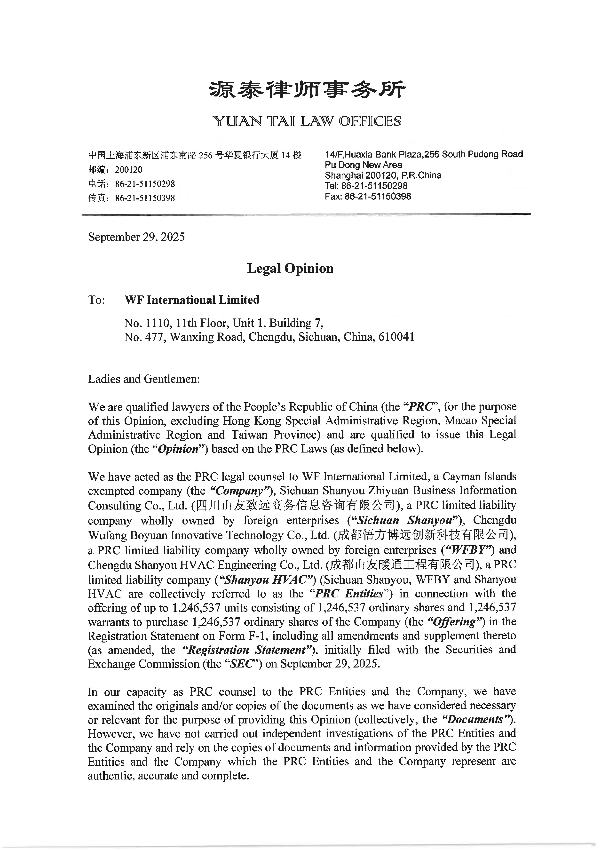 | “WF” | WF International Limited, a Cayman Islands holding company | |