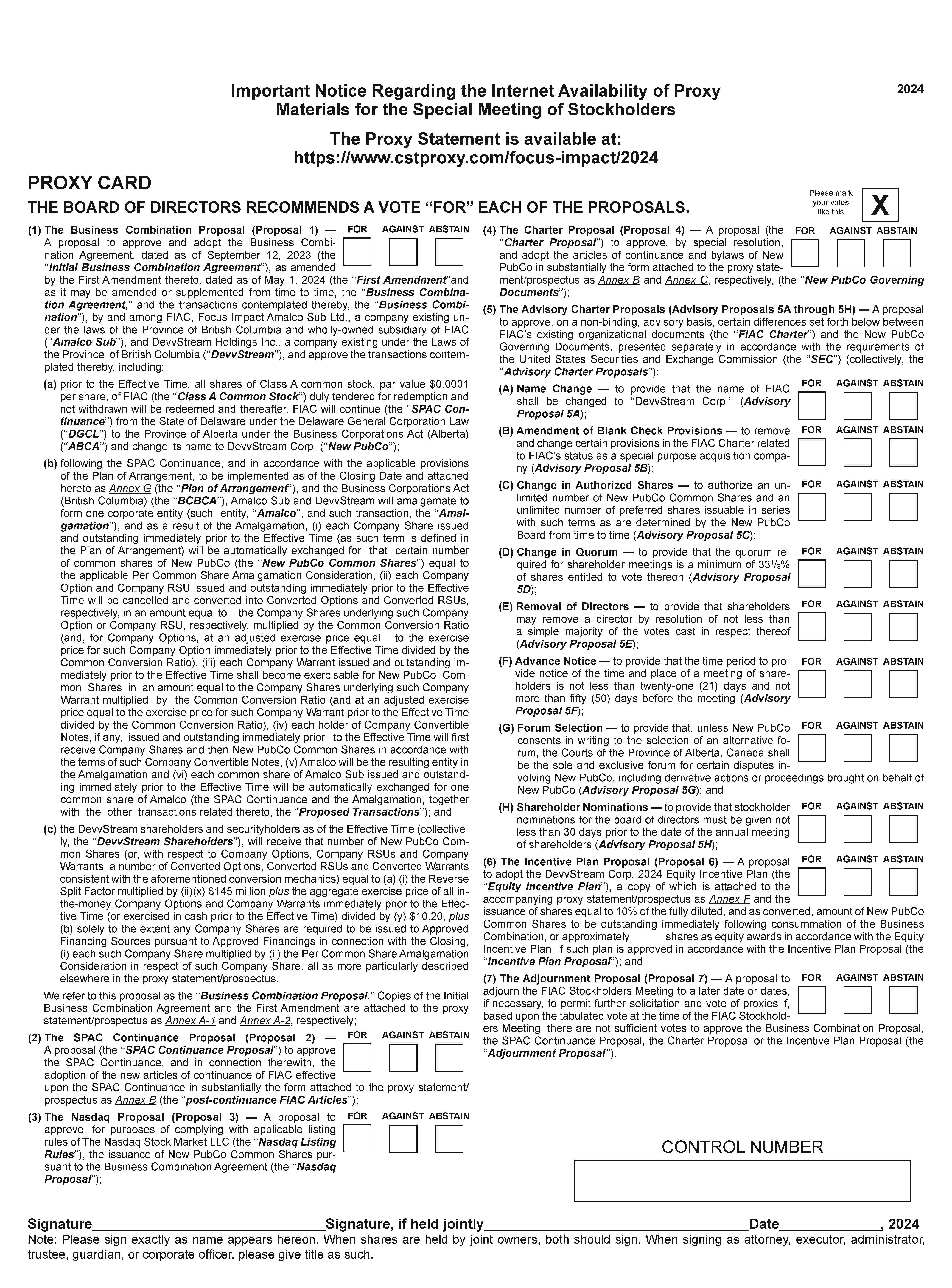 and as it may be amended or supplemented from time to time, the “Business Combination Agreement”), by and among FIAC, Amalco Sub, and DevvStream. Capitalized