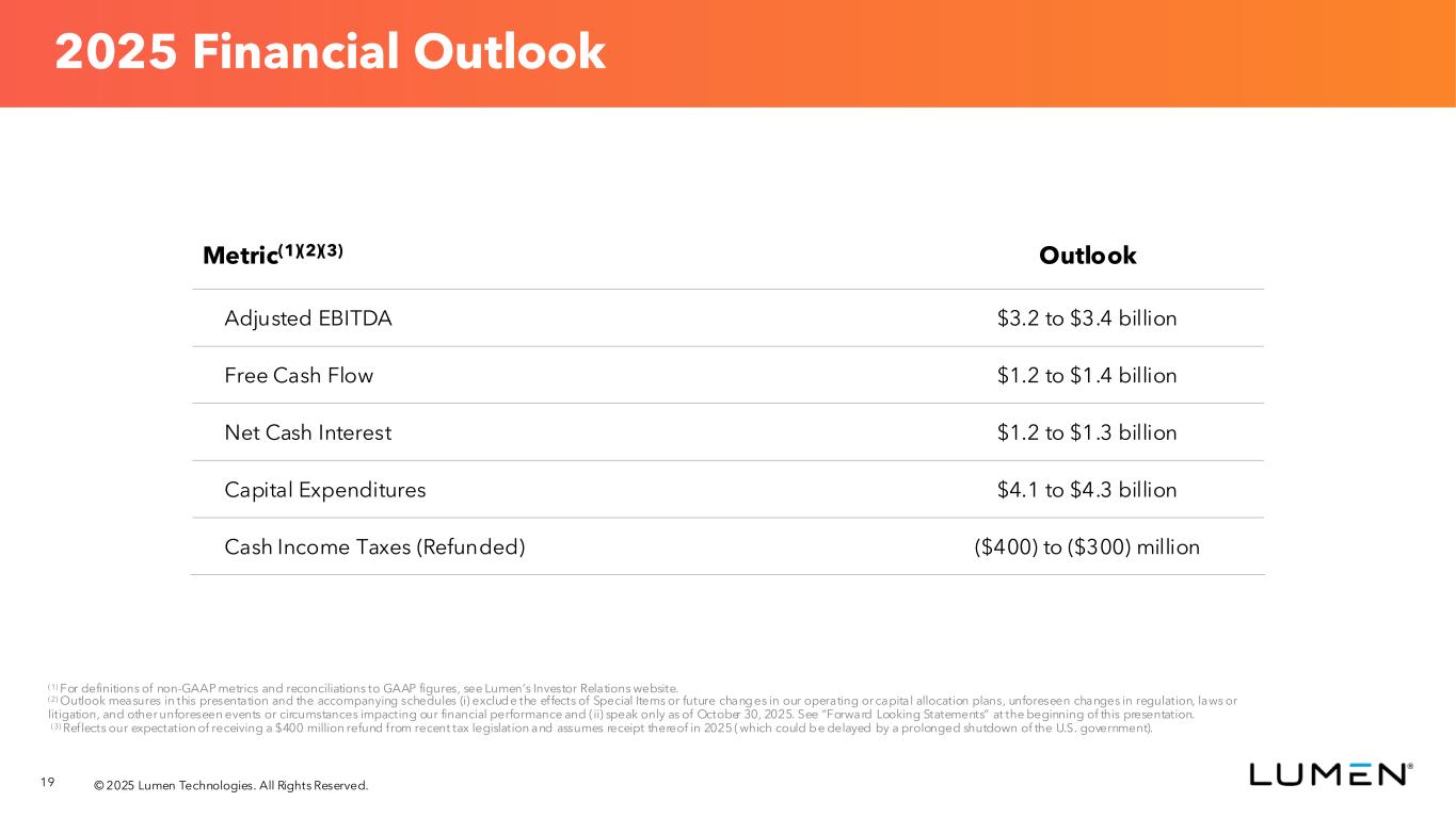 DENVER, October 30, 2025 — Lumen Technologies (NYSE: LUMN) today reported strong third-quarter results that demonstrate continued progress in its bold transformation and position the company on a path to sustainable growth. Among the company’s highlights during the quarter: