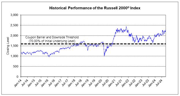 The following graph sets forth the historical performance of the RTY Index from January 2, 2014 through October 18, 2024, based on the daily Closing Levels of the RTY Index. The Closing Level of the RTY Index on October 18, 2024 was 2,276.090. The dotted line represents the Coupon Barrier and the Downside Threshold of 1,593.263, which is equal to 70.00% of the Initial Underlying Level of the RTY Index.