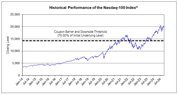 The following graph sets forth the historical performance of the NDX Index from January 2, 2014 through October 18, 2024, based on the daily Closing Levels of the NDX Index. The Closing Level of the NDX Index on October 18, 2024 was 20,324.04. The dotted line represents the Coupon Barrier and the Downside Threshold of 14,226.83, which is equal to 70.00% of the Initial Underlying Level of the NDX Index.