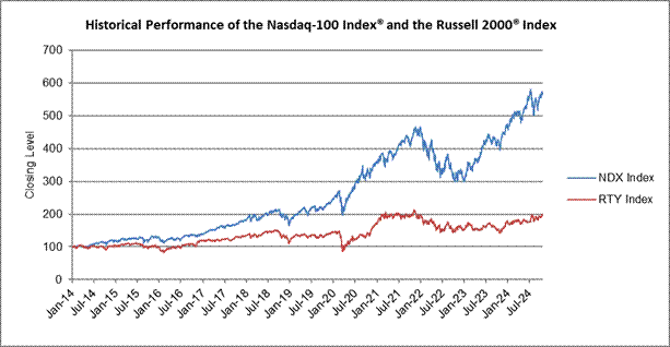 The following graph sets forth the historical performances of the Nasdaq-100 Index® and the Russell 2000® Index from January 2, 2014 through October 18, 2024, based on the daily Closing Levels of the Underlyings. For comparison purposes, each Underlying has been normalized to have a Closing Level of 100.00 on January 2, 2014 by dividing the Closing Level of that Underlying on each day by the Closing Level of that Underlying on January 2, 2014 and multiplying by 100.00.