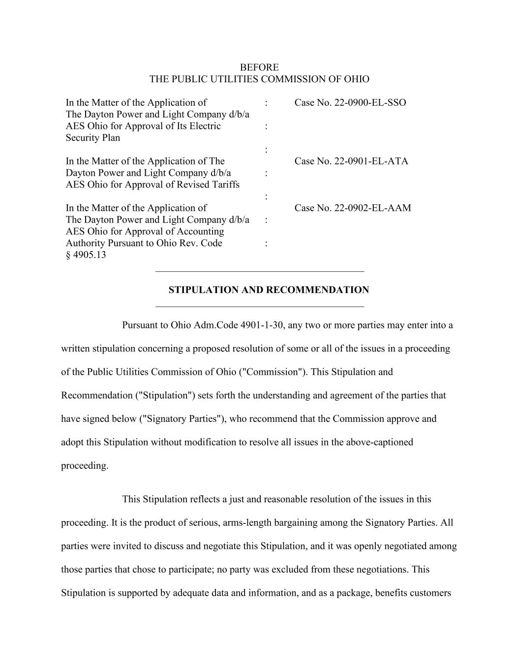 BEFORE THE PUBLIC UTILITIES COMMISSION OF OHIO In the Matter of the Application of The Dayton Power and Light Company d/b/a AES Ohio for Approval of Its Electric Security Plan In the Matter of the Application of The Dayton Power and Light Company d/b/a AES Ohio for Approval of Revised Tariffs In the Matter of the Application of The Dayton Power and Light Company d/b/a AES Ohio for Approval of Accounting Authority Pursuant to Ohio Rev. Code § 4905.13 : : : : : : : Case No. 22-0900-EL-SSO Case No. 22-0901-EL-ATA Case No. 22-0902-EL-AAM _________________________________________ STIPULATION AND RECOMMENDATION _________________________________________ Pursuant to Ohio Adm.Code 4901-1-30, any two or more parties may enter into a written stipulation concerning a proposed resolution of some or all of the issues in a proceeding of the Public Utilities Commission of Ohio ("Commission"). This Stipulation and Recommendation ("Stipulation") sets forth the understanding and agreement of the parties that have signed below ("Signatory Parties"), who recommend that the Commission approve and adopt this Stipulation without modification to resolve all issues in the above-captioned proceeding. This Stipulation reflects a just and reasonable resolution of the issues in this proceeding. It is the product of serious, arms-length bargaining among the Signatory Parties. All parties were invited to discuss and negotiate this Stipulation, and it was openly negotiated among those parties that chose to participate; no party was excluded from these negotiations. This Stipulation is supported by adequate data and information, and as a package, benefits customers