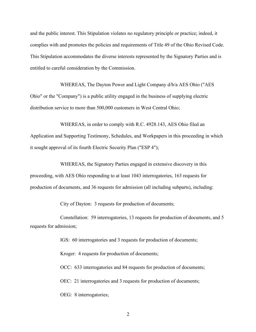2 and the public interest. This Stipulation violates no regulatory principle or practice; indeed, it complies with and promotes the policies and requirements of Title 49 of the Ohio Revised Code. This Stipulation accommodates the diverse interests represented by the Signatory Parties and is entitled to careful consideration by the Commission. WHEREAS, The Dayton Power and Light Company d/b/a AES Ohio ("AES Ohio" or the "Company") is a public utility engaged in the business of supplying electric distribution service to more than 500,000 customers in West Central Ohio; WHEREAS, in order to comply with R.C. 4928.143, AES Ohio filed an Application and Supporting Testimony, Schedules, and Workpapers in this proceeding in which it sought approval of its fourth Electric Security Plan ("ESP 4"); WHEREAS, the Signatory Parties engaged in extensive discovery in this proceeding, with AES Ohio responding to at least 1043 interrogatories, 163 requests for production of documents, and 36 requests for admission (all including subparts), including: City of Dayton: 3 requests for production of documents; Constellation: 59 interrogatories, 13 requests for production of documents, and 5 requests for admission; IGS: 60 interrogatories and 3 requests for production of documents; Kroger: 4 requests for production of documents; OCC: 633 interrogatories and 84 requests for production of documents; OEC: 21 interrogatories and 3 requests for production of documents; OEG: 8 interrogatories;