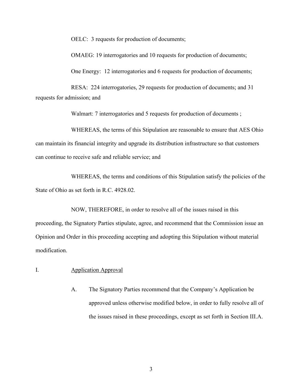 3 OELC: 3 requests for production of documents; OMAEG: 19 interrogatories and 10 requests for production of documents; One Energy: 12 interrogatories and 6 requests for production of documents; RESA: 224 interrogatories, 29 requests for production of documents; and 31 requests for admission; and Walmart: 7 interrogatories and 5 requests for production of documents ; WHEREAS, the terms of this Stipulation are reasonable to ensure that AES Ohio can maintain its financial integrity and upgrade its distribution infrastructure so that customers can continue to receive safe and reliable service; and WHEREAS, the terms and conditions of this Stipulation satisfy the policies of the State of Ohio as set forth in R.C. 4928.02. NOW, THEREFORE, in order to resolve all of the issues raised in this proceeding, the Signatory Parties stipulate, agree, and recommend that the Commission issue an Opinion and Order in this proceeding accepting and adopting this Stipulation without material modification. I. Application Approval A. The Signatory Parties recommend that the Company’s Application be approved unless otherwise modified below, in order to fully resolve all of the issues raised in these proceedings, except as set forth in Section III.A.