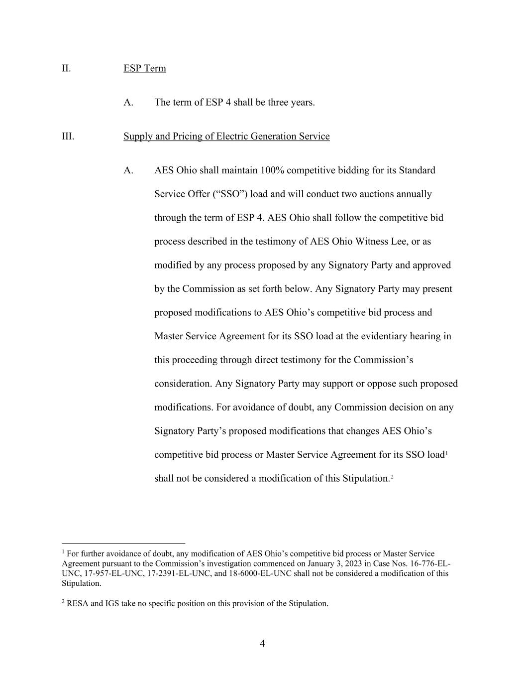 4 II. ESP Term A. The term of ESP 4 shall be three years. III. Supply and Pricing of Electric Generation Service A. AES Ohio shall maintain 100% competitive bidding for its Standard Service Offer (“SSO”) load and will conduct two auctions annually through the term of ESP 4. AES Ohio shall follow the competitive bid process described in the testimony of AES Ohio Witness Lee, or as modified by any process proposed by any Signatory Party and approved by the Commission as set forth below. Any Signatory Party may present proposed modifications to AES Ohio’s competitive bid process and Master Service Agreement for its SSO load at the evidentiary hearing in this proceeding through direct testimony for the Commission’s consideration. Any Signatory Party may support or oppose such proposed modifications. For avoidance of doubt, any Commission decision on any Signatory Party’s proposed modifications that changes AES Ohio’s competitive bid process or Master Service Agreement for its SSO load1 shall not be considered a modification of this Stipulation.2 1 For further avoidance of doubt, any modification of AES Ohio’s competitive bid process or Master Service Agreement pursuant to the Commission’s investigation commenced on January 3, 2023 in Case Nos. 16-776-EL- UNC, 17-957-EL-UNC, 17-2391-EL-UNC, and 18-6000-EL-UNC shall not be considered a modification of this Stipulation. 2 RESA and IGS take no specific position on this provision of the Stipulation.
