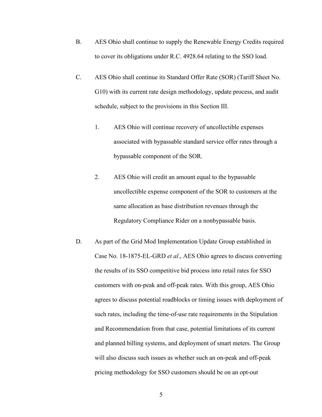 5 B. AES Ohio shall continue to supply the Renewable Energy Credits required to cover its obligations under R.C. 4928.64 relating to the SSO load. C. AES Ohio shall continue its Standard Offer Rate (SOR) (Tariff Sheet No. G10) with its current rate design methodology, update process, and audit schedule, subject to the provisions in this Section III. 1. AES Ohio will continue recovery of uncollectible expenses associated with bypassable standard service offer rates through a bypassable component of the SOR. 2. AES Ohio will credit an amount equal to the bypassable uncollectible expense component of the SOR to customers at the same allocation as base distribution revenues through the Regulatory Compliance Rider on a nonbypassable basis. D. As part of the Grid Mod Implementation Update Group established in Case No. 18-1875-EL-GRD et al., AES Ohio agrees to discuss converting the results of its SSO competitive bid process into retail rates for SSO customers with on-peak and off-peak rates. With this group, AES Ohio agrees to discuss potential roadblocks or timing issues with deployment of such rates, including the time-of-use rate requirements in the Stipulation and Recommendation from that case, potential limitations of its current and planned billing systems, and deployment of smart meters. The Group will also discuss such issues as whether such an on-peak and off-peak pricing methodology for SSO customers should be on an opt-out