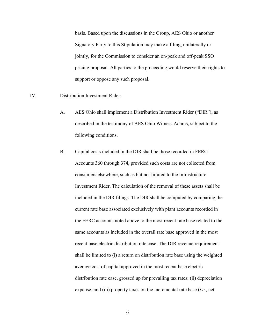 6 basis. Based upon the discussions in the Group, AES Ohio or another Signatory Party to this Stipulation may make a filing, unilaterally or jointly, for the Commission to consider an on-peak and off-peak SSO pricing proposal. All parties to the proceeding would reserve their rights to support or oppose any such proposal. IV. Distribution Investment Rider: A. AES Ohio shall implement a Distribution Investment Rider (“DIR”), as described in the testimony of AES Ohio Witness Adams, subject to the following conditions. B. Capital costs included in the DIR shall be those recorded in FERC Accounts 360 through 374, provided such costs are not collected from consumers elsewhere, such as but not limited to the Infrastructure Investment Rider. The calculation of the removal of these assets shall be included in the DIR filings. The DIR shall be computed by comparing the current rate base associated exclusively with plant accounts recorded in the FERC accounts noted above to the most recent rate base related to the same accounts as included in the overall rate base approved in the most recent base electric distribution rate case. The DIR revenue requirement shall be limited to (i) a return on distribution rate base using the weighted average cost of capital approved in the most recent base electric distribution rate case, grossed up for prevailing tax rates; (ii) depreciation expense; and (iii) property taxes on the incremental rate base (i.e., net