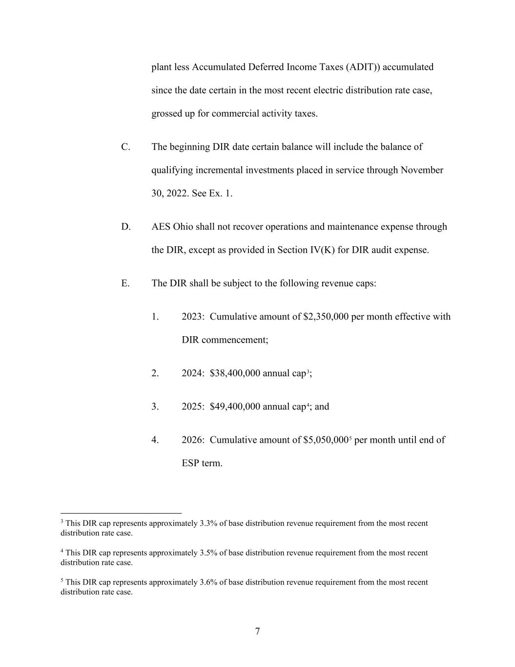 7 plant less Accumulated Deferred Income Taxes (ADIT)) accumulated since the date certain in the most recent electric distribution rate case, grossed up for commercial activity taxes. C. The beginning DIR date certain balance will include the balance of qualifying incremental investments placed in service through November 30, 2022. See Ex. 1. D. AES Ohio shall not recover operations and maintenance expense through the DIR, except as provided in Section IV(K) for DIR audit expense. E. The DIR shall be subject to the following revenue caps: 1. 2023: Cumulative amount of $2,350,000 per month effective with DIR commencement; 2. 2024: $38,400,000 annual cap3; 3. 2025: $49,400,000 annual cap4; and 4. 2026: Cumulative amount of $5,050,0005 per month until end of ESP term. 3 This DIR cap represents approximately 3.3% of base distribution revenue requirement from the most recent distribution rate case. 4 This DIR cap represents approximately 3.5% of base distribution revenue requirement from the most recent distribution rate case. 5 This DIR cap represents approximately 3.6% of base distribution revenue requirement from the most recent distribution rate case.