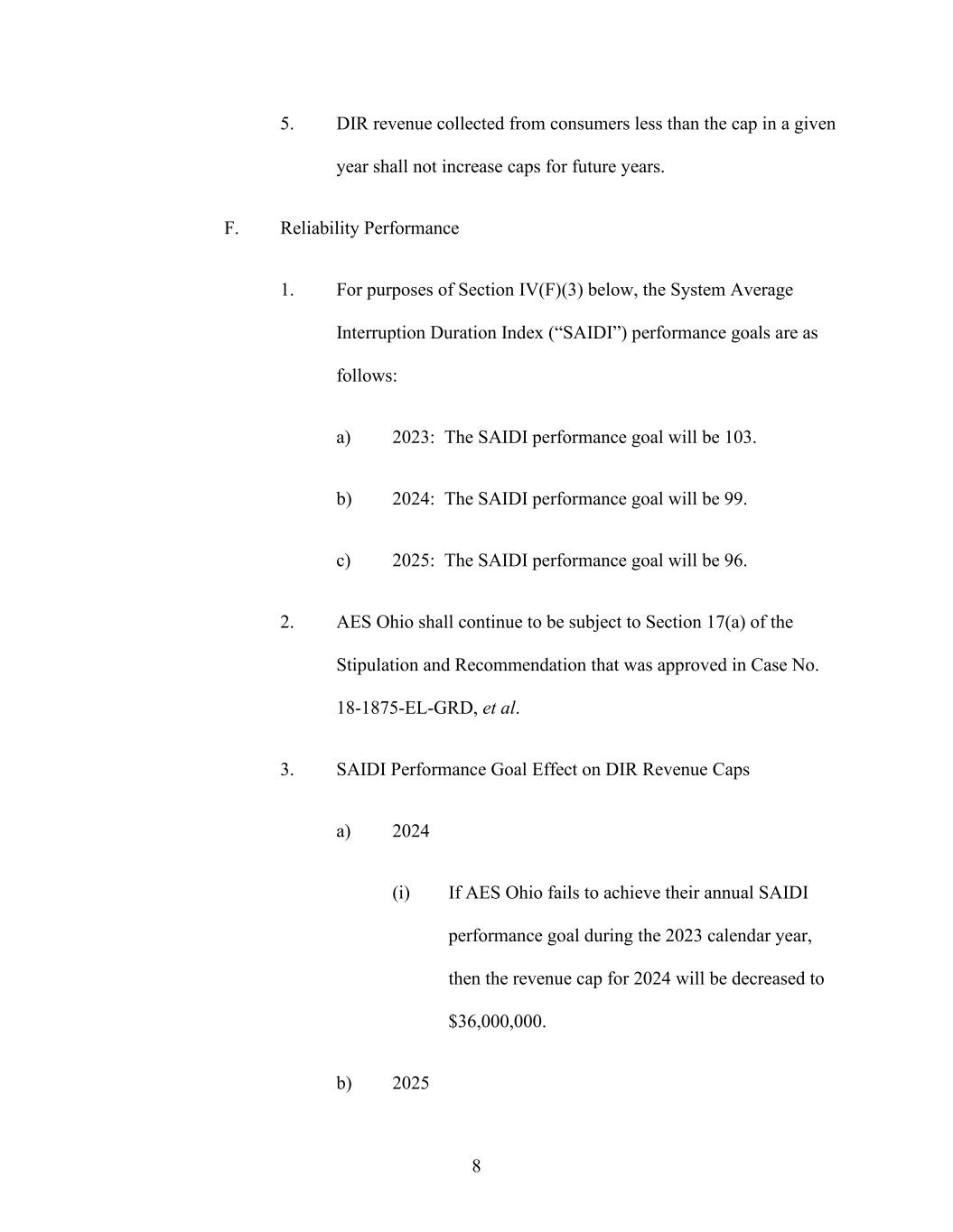 8 5. DIR revenue collected from consumers less than the cap in a given year shall not increase caps for future years. F. Reliability Performance 1. For purposes of Section IV(F)(3) below, the System Average Interruption Duration Index (“SAIDI”) performance goals are as follows: a) 2023: The SAIDI performance goal will be 103. b) 2024: The SAIDI performance goal will be 99. c) 2025: The SAIDI performance goal will be 96. 2. AES Ohio shall continue to be subject to Section 17(a) of the Stipulation and Recommendation that was approved in Case No. 18-1875-EL-GRD, et al. 3. SAIDI Performance Goal Effect on DIR Revenue Caps a) 2024 (i) If AES Ohio fails to achieve their annual SAIDI performance goal during the 2023 calendar year, then the revenue cap for 2024 will be decreased to $36,000,000. b) 2025