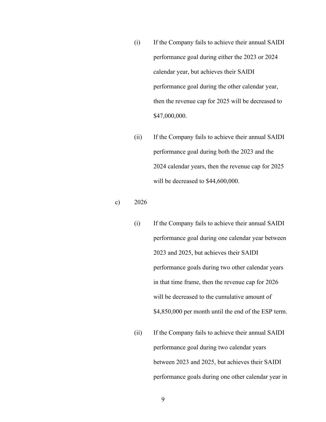 9 (i) If the Company fails to achieve their annual SAIDI performance goal during either the 2023 or 2024 calendar year, but achieves their SAIDI performance goal during the other calendar year, then the revenue cap for 2025 will be decreased to $47,000,000. (ii) If the Company fails to achieve their annual SAIDI performance goal during both the 2023 and the 2024 calendar years, then the revenue cap for 2025 will be decreased to $44,600,000. c) 2026 (i) If the Company fails to achieve their annual SAIDI performance goal during one calendar year between 2023 and 2025, but achieves their SAIDI performance goals during two other calendar years in that time frame, then the revenue cap for 2026 will be decreased to the cumulative amount of $4,850,000 per month until the end of the ESP term. (ii) If the Company fails to achieve their annual SAIDI performance goal during two calendar years between 2023 and 2025, but achieves their SAIDI performance goals during one other calendar year in