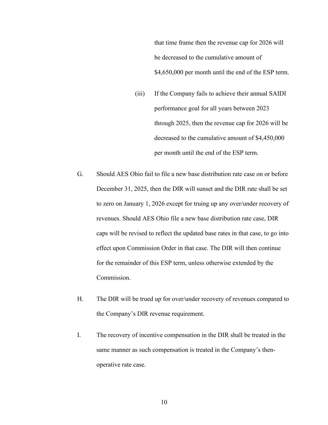 10 that time frame then the revenue cap for 2026 will be decreased to the cumulative amount of $4,650,000 per month until the end of the ESP term. (iii) If the Company fails to achieve their annual SAIDI performance goal for all years between 2023 through 2025, then the revenue cap for 2026 will be decreased to the cumulative amount of $4,450,000 per month until the end of the ESP term. G. Should AES Ohio fail to file a new base distribution rate case on or before December 31, 2025, then the DIR will sunset and the DIR rate shall be set to zero on January 1, 2026 except for truing up any over/under recovery of revenues. Should AES Ohio file a new base distribution rate case, DIR caps will be revised to reflect the updated base rates in that case, to go into effect upon Commission Order in that case. The DIR will then continue for the remainder of this ESP term, unless otherwise extended by the Commission. H. The DIR will be trued up for over/under recovery of revenues compared to the Company’s DIR revenue requirement. I. The recovery of incentive compensation in the DIR shall be treated in the same manner as such compensation is treated in the Company’s then- operative rate case.