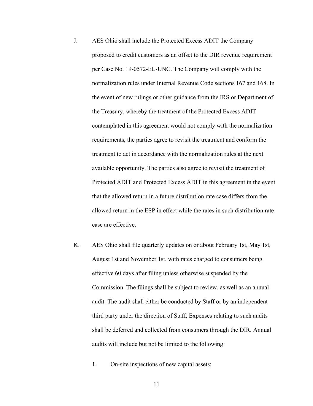 11 J. AES Ohio shall include the Protected Excess ADIT the Company proposed to credit customers as an offset to the DIR revenue requirement per Case No. 19-0572-EL-UNC. The Company will comply with the normalization rules under Internal Revenue Code sections 167 and 168. In the event of new rulings or other guidance from the IRS or Department of the Treasury, whereby the treatment of the Protected Excess ADIT contemplated in this agreement would not comply with the normalization requirements, the parties agree to revisit the treatment and conform the treatment to act in accordance with the normalization rules at the next available opportunity. The parties also agree to revisit the treatment of Protected ADIT and Protected Excess ADIT in this agreement in the event that the allowed return in a future distribution rate case differs from the allowed return in the ESP in effect while the rates in such distribution rate case are effective. K. AES Ohio shall file quarterly updates on or about February 1st, May 1st, August 1st and November 1st, with rates charged to consumers being effective 60 days after filing unless otherwise suspended by the Commission. The filings shall be subject to review, as well as an annual audit. The audit shall either be conducted by Staff or by an independent third party under the direction of Staff. Expenses relating to such audits shall be deferred and collected from consumers through the DIR. Annual audits will include but not be limited to the following: 1. On-site inspections of new capital assets;