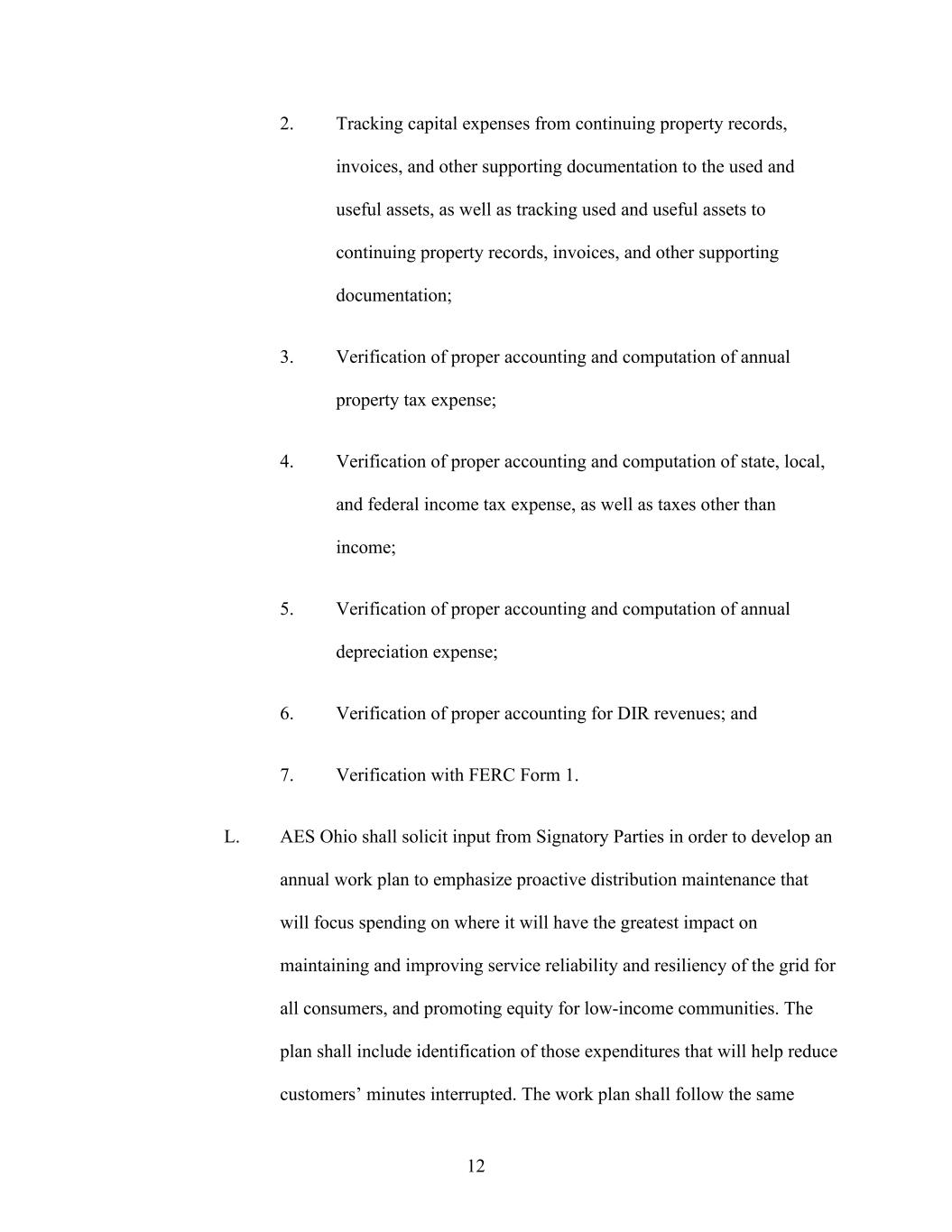 12 2. Tracking capital expenses from continuing property records, invoices, and other supporting documentation to the used and useful assets, as well as tracking used and useful assets to continuing property records, invoices, and other supporting documentation; 3. Verification of proper accounting and computation of annual property tax expense; 4. Verification of proper accounting and computation of state, local, and federal income tax expense, as well as taxes other than income; 5. Verification of proper accounting and computation of annual depreciation expense; 6. Verification of proper accounting for DIR revenues; and 7. Verification with FERC Form 1. L. AES Ohio shall solicit input from Signatory Parties in order to develop an annual work plan to emphasize proactive distribution maintenance that will focus spending on where it will have the greatest impact on maintaining and improving service reliability and resiliency of the grid for all consumers, and promoting equity for low-income communities. The plan shall include identification of those expenditures that will help reduce customers’ minutes interrupted. The work plan shall follow the same