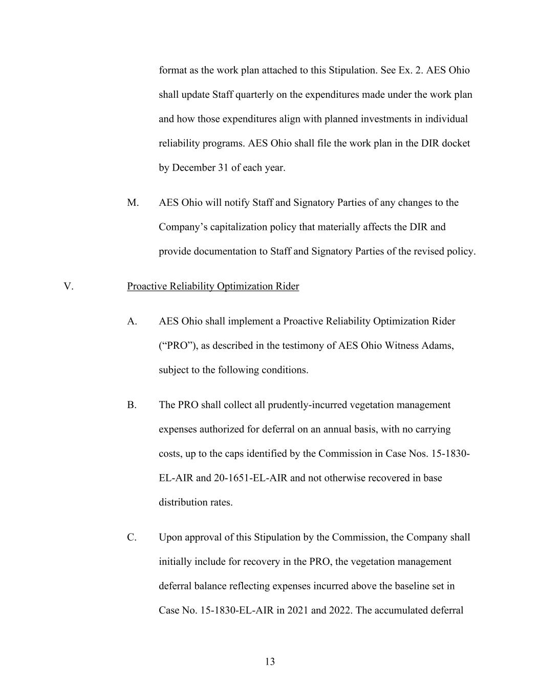 13 format as the work plan attached to this Stipulation. See Ex. 2. AES Ohio shall update Staff quarterly on the expenditures made under the work plan and how those expenditures align with planned investments in individual reliability programs. AES Ohio shall file the work plan in the DIR docket by December 31 of each year. M. AES Ohio will notify Staff and Signatory Parties of any changes to the Company’s capitalization policy that materially affects the DIR and provide documentation to Staff and Signatory Parties of the revised policy. V. Proactive Reliability Optimization Rider A. AES Ohio shall implement a Proactive Reliability Optimization Rider (“PRO”), as described in the testimony of AES Ohio Witness Adams, subject to the following conditions. B. The PRO shall collect all prudently-incurred vegetation management expenses authorized for deferral on an annual basis, with no carrying costs, up to the caps identified by the Commission in Case Nos. 15-1830- EL-AIR and 20-1651-EL-AIR and not otherwise recovered in base distribution rates. C. Upon approval of this Stipulation by the Commission, the Company shall initially include for recovery in the PRO, the vegetation management deferral balance reflecting expenses incurred above the baseline set in Case No. 15-1830-EL-AIR in 2021 and 2022. The accumulated deferral