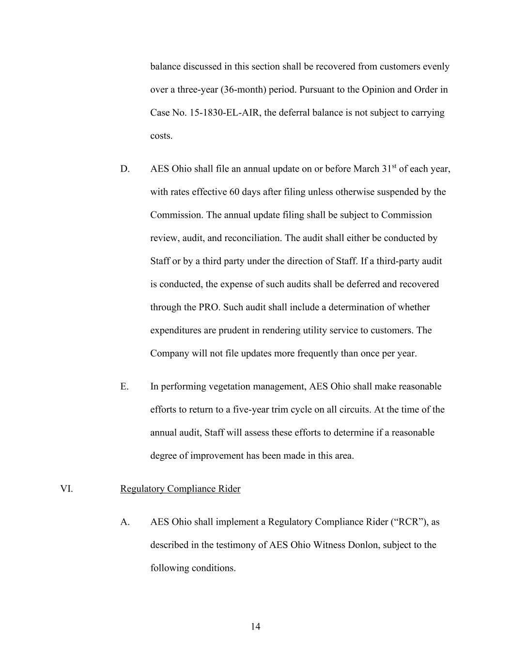 14 balance discussed in this section shall be recovered from customers evenly over a three-year (36-month) period. Pursuant to the Opinion and Order in Case No. 15-1830-EL-AIR, the deferral balance is not subject to carrying costs. D. AES Ohio shall file an annual update on or before March 31st of each year, with rates effective 60 days after filing unless otherwise suspended by the Commission. The annual update filing shall be subject to Commission review, audit, and reconciliation. The audit shall either be conducted by Staff or by a third party under the direction of Staff. If a third-party audit is conducted, the expense of such audits shall be deferred and recovered through the PRO. Such audit shall include a determination of whether expenditures are prudent in rendering utility service to customers. The Company will not file updates more frequently than once per year. E. In performing vegetation management, AES Ohio shall make reasonable efforts to return to a five-year trim cycle on all circuits. At the time of the annual audit, Staff will assess these efforts to determine if a reasonable degree of improvement has been made in this area. VI. Regulatory Compliance Rider A. AES Ohio shall implement a Regulatory Compliance Rider (“RCR”), as described in the testimony of AES Ohio Witness Donlon, subject to the following conditions.