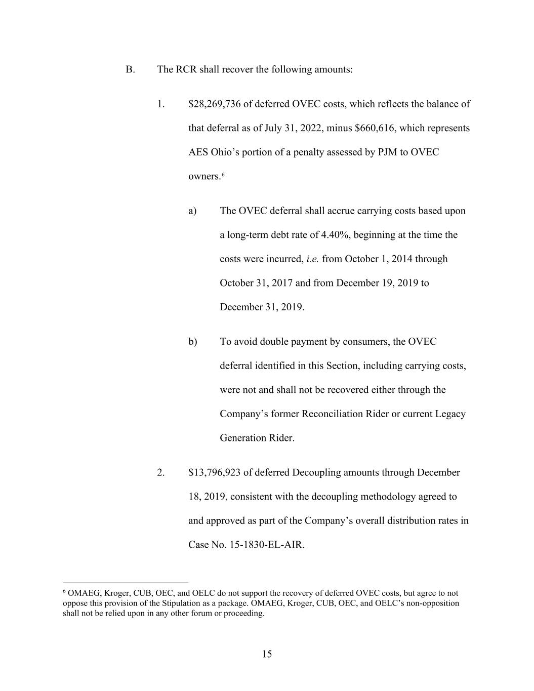 15 B. The RCR shall recover the following amounts: 1. $28,269,736 of deferred OVEC costs, which reflects the balance of that deferral as of July 31, 2022, minus $660,616, which represents AES Ohio’s portion of a penalty assessed by PJM to OVEC owners.6 a) The OVEC deferral shall accrue carrying costs based upon a long-term debt rate of 4.40%, beginning at the time the costs were incurred, i.e. from October 1, 2014 through October 31, 2017 and from December 19, 2019 to December 31, 2019. b) To avoid double payment by consumers, the OVEC deferral identified in this Section, including carrying costs, were not and shall not be recovered either through the Company’s former Reconciliation Rider or current Legacy Generation Rider. 2. $13,796,923 of deferred Decoupling amounts through December 18, 2019, consistent with the decoupling methodology agreed to and approved as part of the Company’s overall distribution rates in Case No. 15-1830-EL-AIR. 6 OMAEG, Kroger, CUB, OEC, and OELC do not support the recovery of deferred OVEC costs, but agree to not oppose this provision of the Stipulation as a package. OMAEG, Kroger, CUB, OEC, and OELC’s non-opposition shall not be relied upon in any other forum or proceeding.
