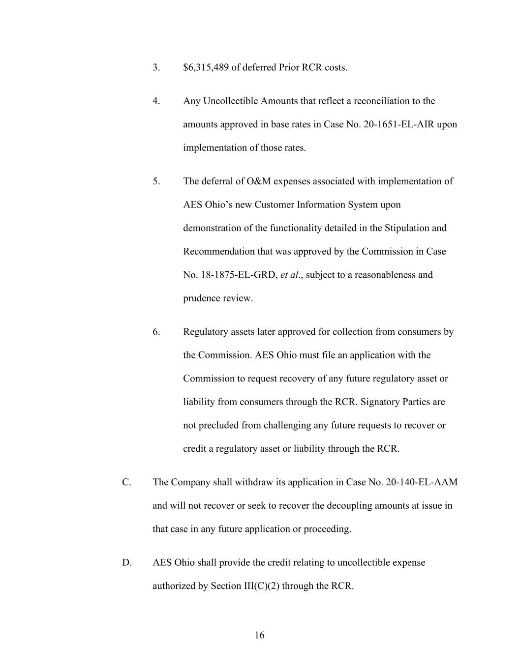 16 3. $6,315,489 of deferred Prior RCR costs. 4. Any Uncollectible Amounts that reflect a reconciliation to the amounts approved in base rates in Case No. 20-1651-EL-AIR upon implementation of those rates. 5. The deferral of O&M expenses associated with implementation of AES Ohio’s new Customer Information System upon demonstration of the functionality detailed in the Stipulation and Recommendation that was approved by the Commission in Case No. 18-1875-EL-GRD, et al., subject to a reasonableness and prudence review. 6. Regulatory assets later approved for collection from consumers by the Commission. AES Ohio must file an application with the Commission to request recovery of any future regulatory asset or liability from consumers through the RCR. Signatory Parties are not precluded from challenging any future requests to recover or credit a regulatory asset or liability through the RCR. C. The Company shall withdraw its application in Case No. 20-140-EL-AAM and will not recover or seek to recover the decoupling amounts at issue in that case in any future application or proceeding. D. AES Ohio shall provide the credit relating to uncollectible expense authorized by Section III(C)(2) through the RCR.