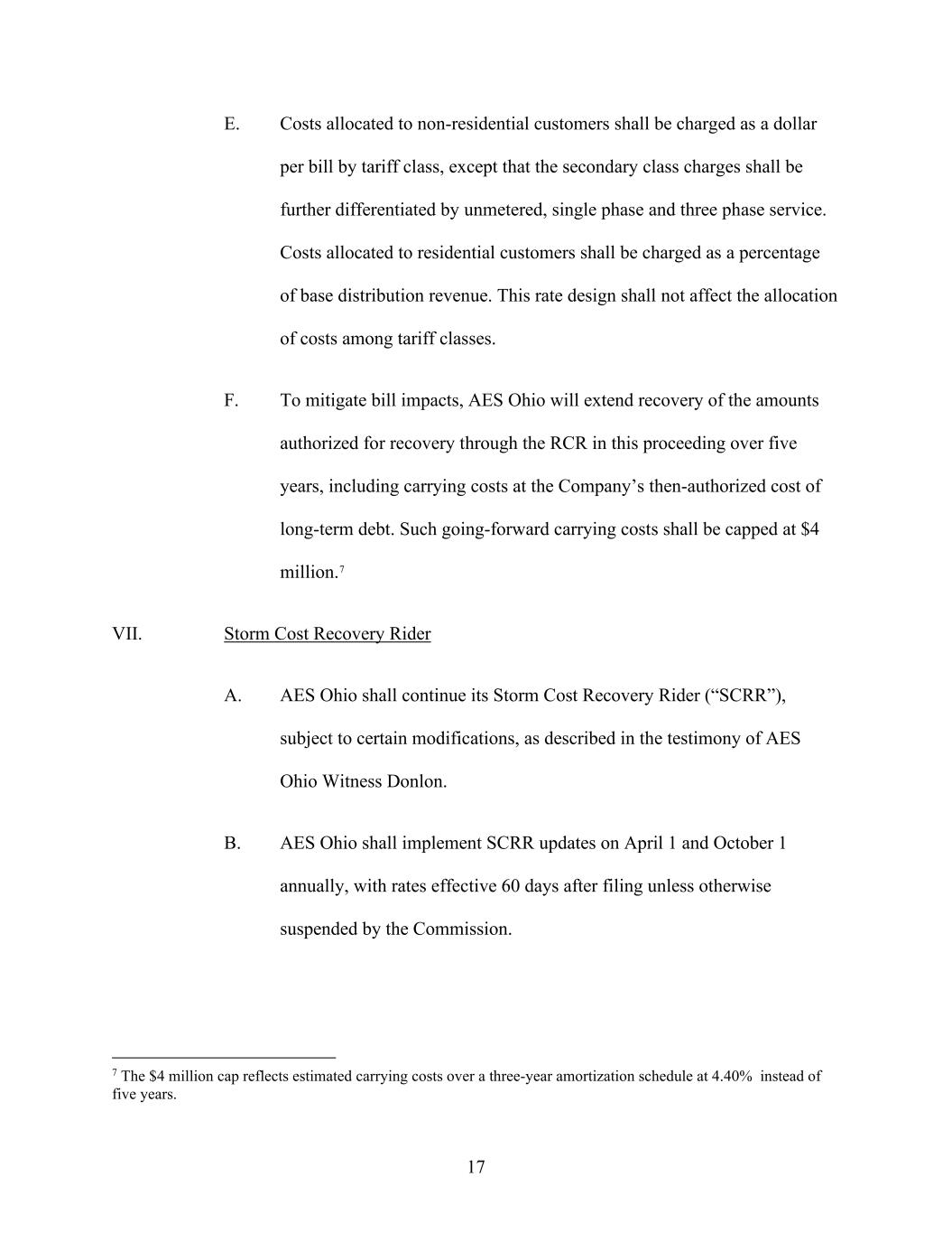 17 E. Costs allocated to non-residential customers shall be charged as a dollar per bill by tariff class, except that the secondary class charges shall be further differentiated by unmetered, single phase and three phase service. Costs allocated to residential customers shall be charged as a percentage of base distribution revenue. This rate design shall not affect the allocation of costs among tariff classes. F. To mitigate bill impacts, AES Ohio will extend recovery of the amounts authorized for recovery through the RCR in this proceeding over five years, including carrying costs at the Company’s then-authorized cost of long-term debt. Such going-forward carrying costs shall be capped at $4 million.7 VII. Storm Cost Recovery Rider A. AES Ohio shall continue its Storm Cost Recovery Rider (“SCRR”), subject to certain modifications, as described in the testimony of AES Ohio Witness Donlon. B. AES Ohio shall implement SCRR updates on April 1 and October 1 annually, with rates effective 60 days after filing unless otherwise suspended by the Commission. 7 The $4 million cap reflects estimated carrying costs over a three-year amortization schedule at 4.40% instead of five years.