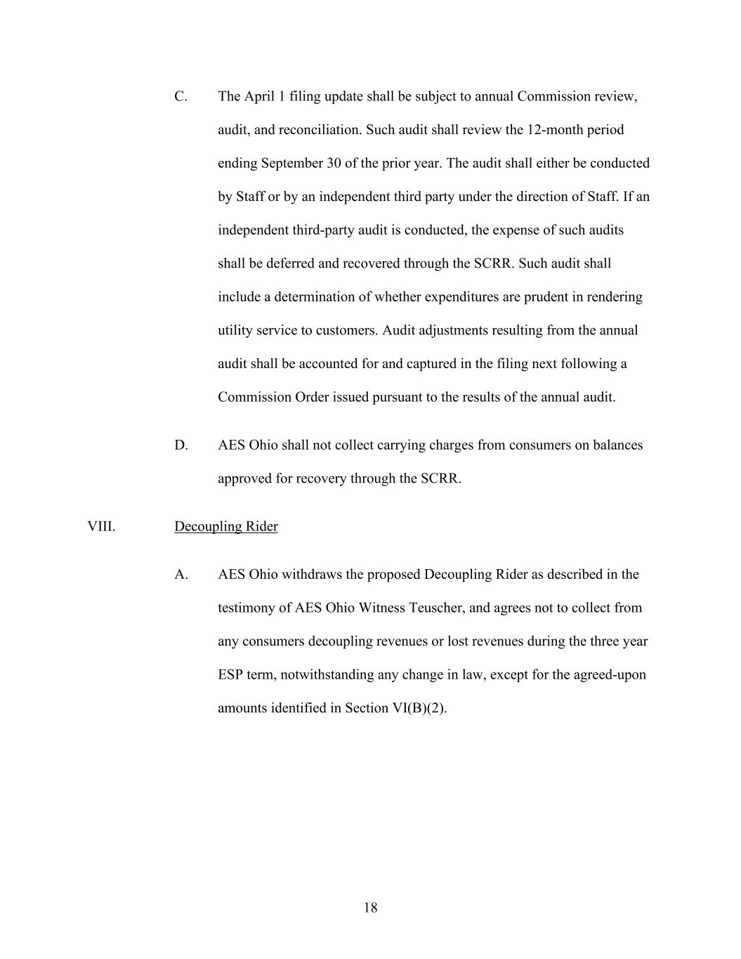 18 C. The April 1 filing update shall be subject to annual Commission review, audit, and reconciliation. Such audit shall review the 12-month period ending September 30 of the prior year. The audit shall either be conducted by Staff or by an independent third party under the direction of Staff. If an independent third-party audit is conducted, the expense of such audits shall be deferred and recovered through the SCRR. Such audit shall include a determination of whether expenditures are prudent in rendering utility service to customers. Audit adjustments resulting from the annual audit shall be accounted for and captured in the filing next following a Commission Order issued pursuant to the results of the annual audit. D. AES Ohio shall not collect carrying charges from consumers on balances approved for recovery through the SCRR. VIII. Decoupling Rider A. AES Ohio withdraws the proposed Decoupling Rider as described in the testimony of AES Ohio Witness Teuscher, and agrees not to collect from any consumers decoupling revenues or lost revenues during the three year ESP term, notwithstanding any change in law, except for the agreed-upon amounts identified in Section VI(B)(2).