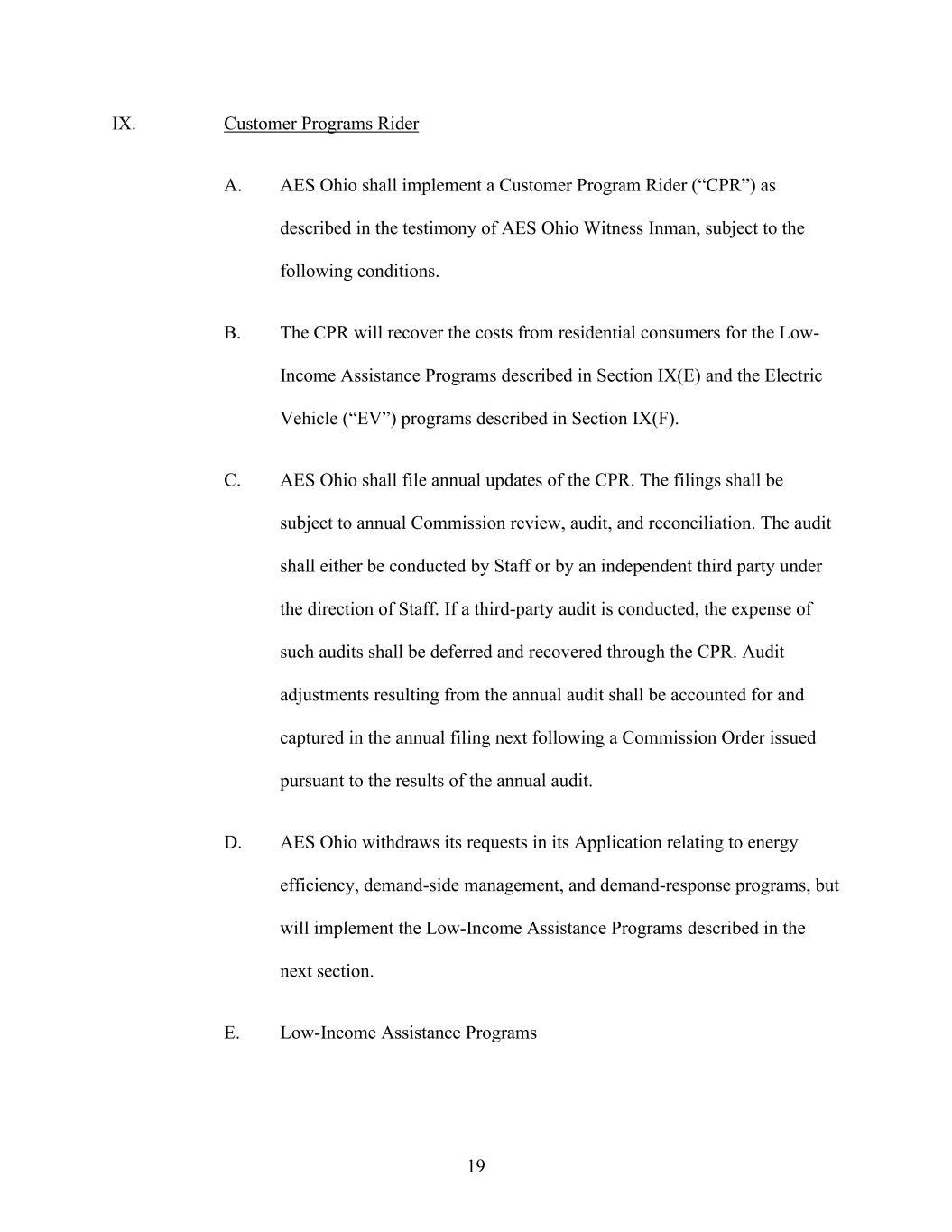 19 IX. Customer Programs Rider A. AES Ohio shall implement a Customer Program Rider (“CPR”) as described in the testimony of AES Ohio Witness Inman, subject to the following conditions. B. The CPR will recover the costs from residential consumers for the Low- Income Assistance Programs described in Section IX(E) and the Electric Vehicle (“EV”) programs described in Section IX(F). C. AES Ohio shall file annual updates of the CPR. The filings shall be subject to annual Commission review, audit, and reconciliation. The audit shall either be conducted by Staff or by an independent third party under the direction of Staff. If a third-party audit is conducted, the expense of such audits shall be deferred and recovered through the CPR. Audit adjustments resulting from the annual audit shall be accounted for and captured in the annual filing next following a Commission Order issued pursuant to the results of the annual audit. D. AES Ohio withdraws its requests in its Application relating to energy efficiency, demand-side management, and demand-response programs, but will implement the Low-Income Assistance Programs described in the next section. E. Low-Income Assistance Programs