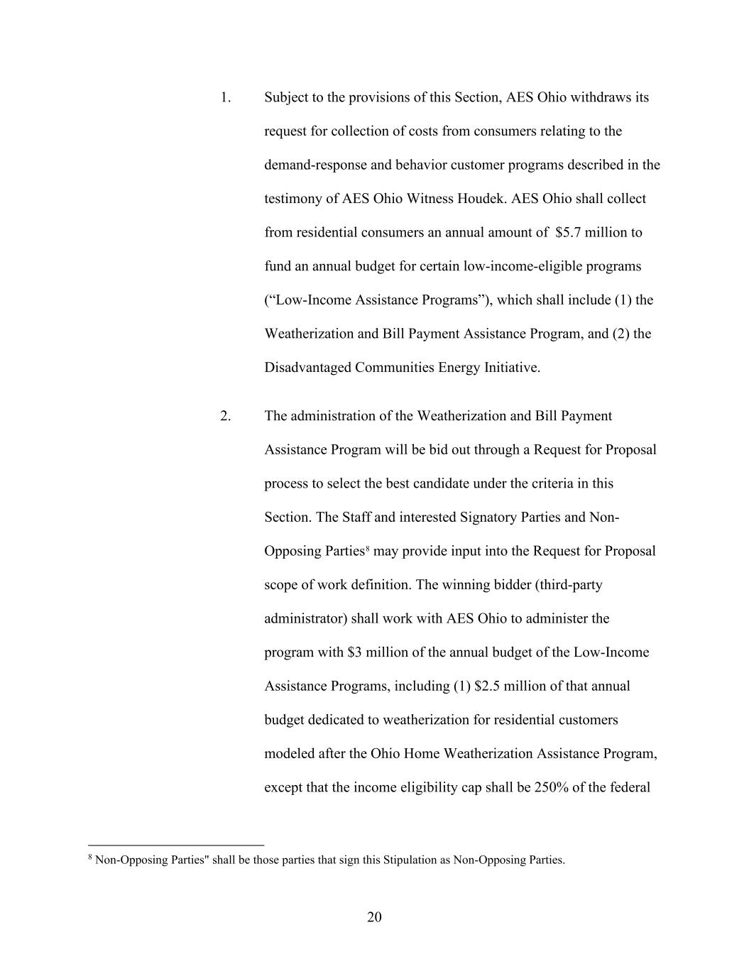 20 1. Subject to the provisions of this Section, AES Ohio withdraws its request for collection of costs from consumers relating to the demand-response and behavior customer programs described in the testimony of AES Ohio Witness Houdek. AES Ohio shall collect from residential consumers an annual amount of $5.7 million to fund an annual budget for certain low-income-eligible programs (“Low-Income Assistance Programs”), which shall include (1) the Weatherization and Bill Payment Assistance Program, and (2) the Disadvantaged Communities Energy Initiative. 2. The administration of the Weatherization and Bill Payment Assistance Program will be bid out through a Request for Proposal process to select the best candidate under the criteria in this Section. The Staff and interested Signatory Parties and Non- Opposing Parties8 may provide input into the Request for Proposal scope of work definition. The winning bidder (third-party administrator) shall work with AES Ohio to administer the program with $3 million of the annual budget of the Low-Income Assistance Programs, including (1) $2.5 million of that annual budget dedicated to weatherization for residential customers modeled after the Ohio Home Weatherization Assistance Program, except that the income eligibility cap shall be 250% of the federal 8 Non-Opposing Parties" shall be those parties that sign this Stipulation as Non-Opposing Parties.