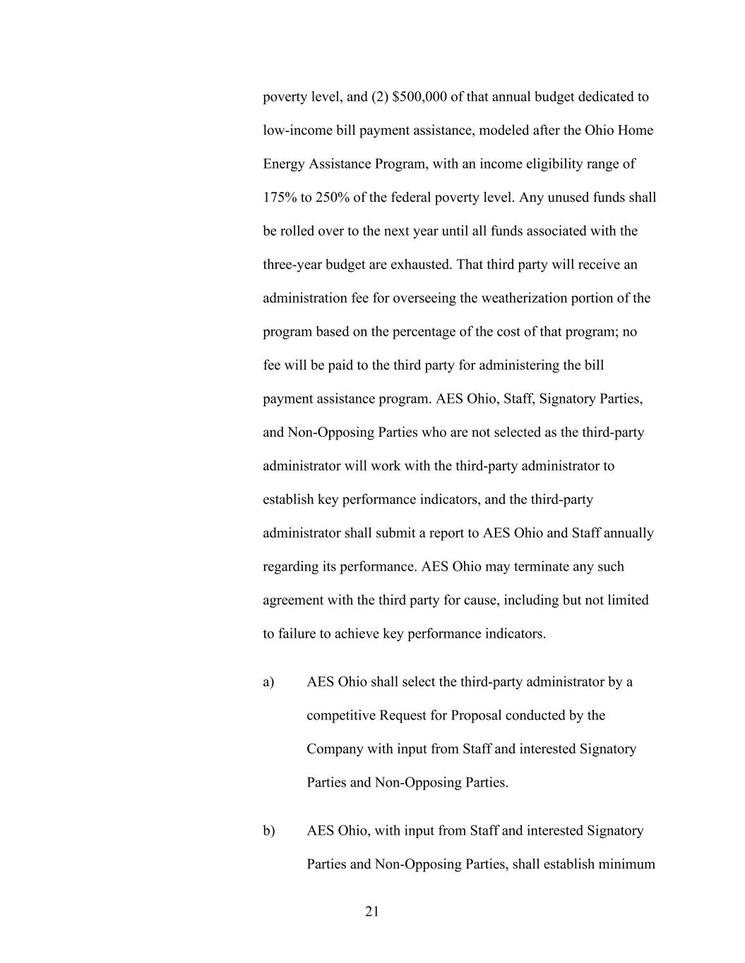 21 poverty level, and (2) $500,000 of that annual budget dedicated to low-income bill payment assistance, modeled after the Ohio Home Energy Assistance Program, with an income eligibility range of 175% to 250% of the federal poverty level. Any unused funds shall be rolled over to the next year until all funds associated with the three-year budget are exhausted. That third party will receive an administration fee for overseeing the weatherization portion of the program based on the percentage of the cost of that program; no fee will be paid to the third party for administering the bill payment assistance program. AES Ohio, Staff, Signatory Parties, and Non-Opposing Parties who are not selected as the third-party administrator will work with the third-party administrator to establish key performance indicators, and the third-party administrator shall submit a report to AES Ohio and Staff annually regarding its performance. AES Ohio may terminate any such agreement with the third party for cause, including but not limited to failure to achieve key performance indicators. a) AES Ohio shall select the third-party administrator by a competitive Request for Proposal conducted by the Company with input from Staff and interested Signatory Parties and Non-Opposing Parties. b) AES Ohio, with input from Staff and interested Signatory Parties and Non-Opposing Parties, shall establish minimum
