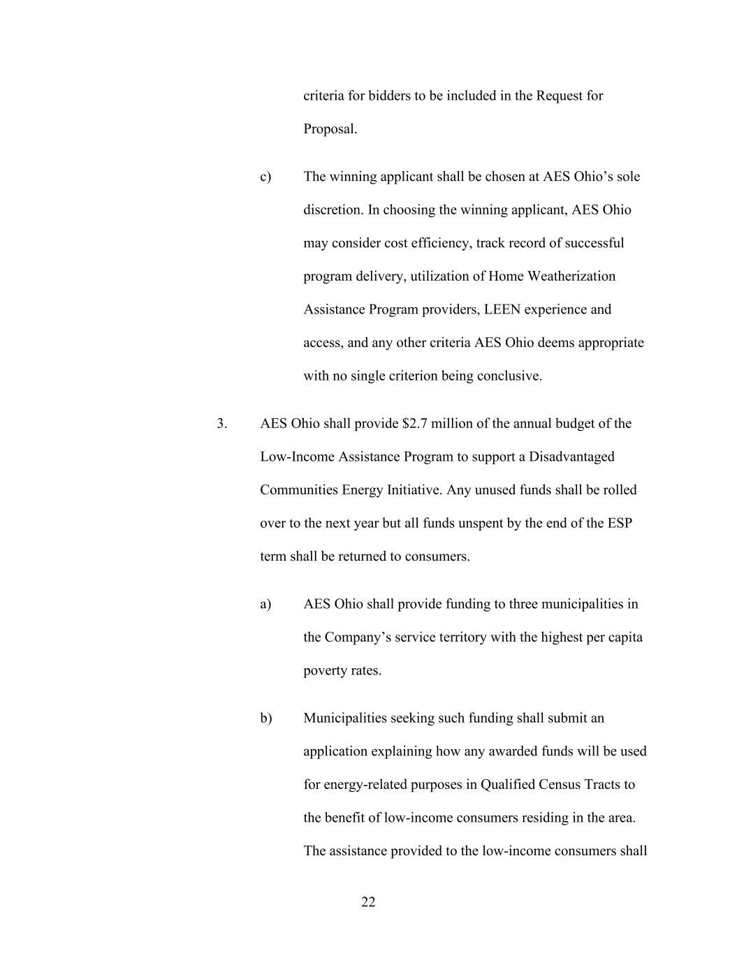 22 criteria for bidders to be included in the Request for Proposal. c) The winning applicant shall be chosen at AES Ohio’s sole discretion. In choosing the winning applicant, AES Ohio may consider cost efficiency, track record of successful program delivery, utilization of Home Weatherization Assistance Program providers, LEEN experience and access, and any other criteria AES Ohio deems appropriate with no single criterion being conclusive. 3. AES Ohio shall provide $2.7 million of the annual budget of the Low-Income Assistance Program to support a Disadvantaged Communities Energy Initiative. Any unused funds shall be rolled over to the next year but all funds unspent by the end of the ESP term shall be returned to consumers. a) AES Ohio shall provide funding to three municipalities in the Company’s service territory with the highest per capita poverty rates. b) Municipalities seeking such funding shall submit an application explaining how any awarded funds will be used for energy-related purposes in Qualified Census Tracts to the benefit of low-income consumers residing in the area. The assistance provided to the low-income consumers shall