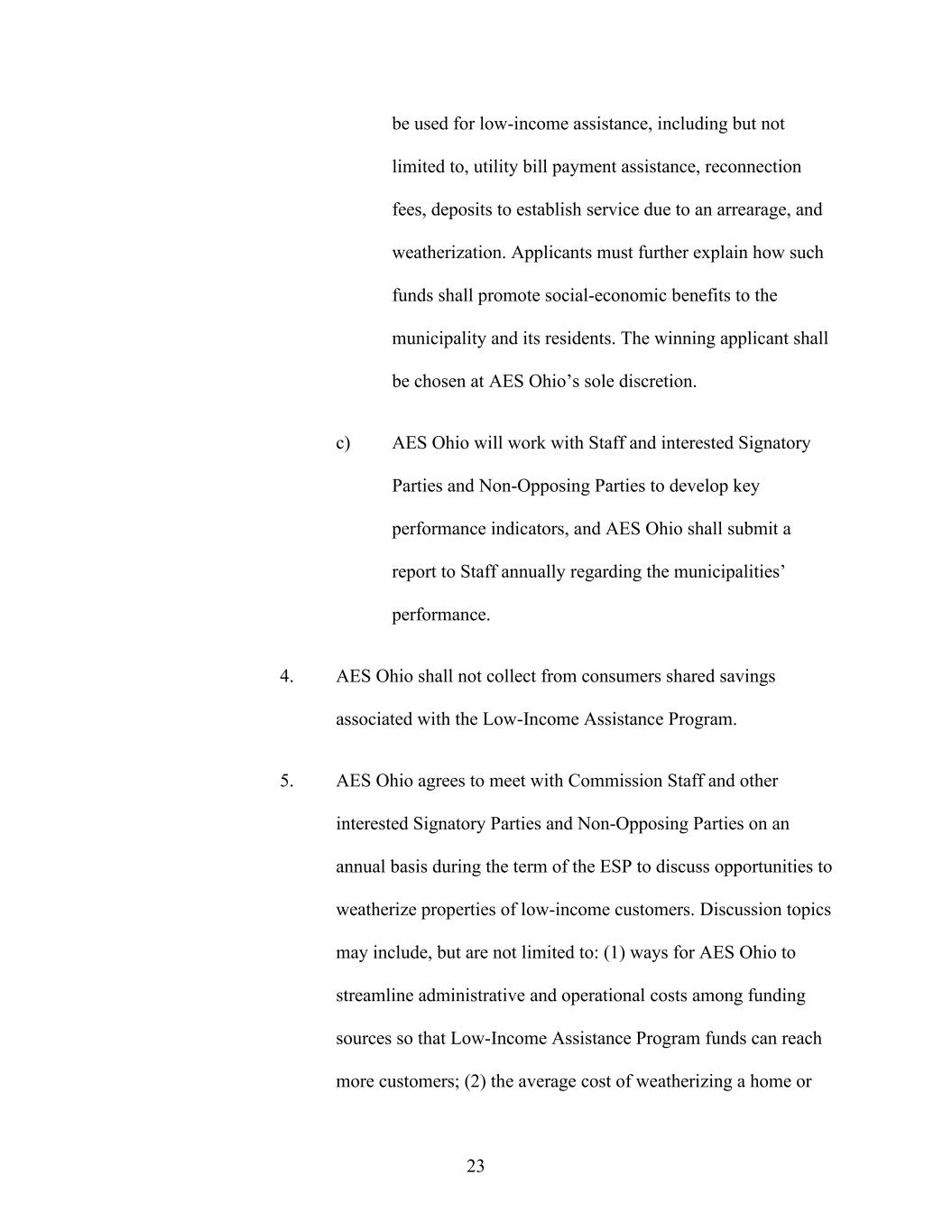 23 be used for low-income assistance, including but not limited to, utility bill payment assistance, reconnection fees, deposits to establish service due to an arrearage, and weatherization. Applicants must further explain how such funds shall promote social-economic benefits to the municipality and its residents. The winning applicant shall be chosen at AES Ohio’s sole discretion. c) AES Ohio will work with Staff and interested Signatory Parties and Non-Opposing Parties to develop key performance indicators, and AES Ohio shall submit a report to Staff annually regarding the municipalities’ performance. 4. AES Ohio shall not collect from consumers shared savings associated with the Low-Income Assistance Program. 5. AES Ohio agrees to meet with Commission Staff and other interested Signatory Parties and Non-Opposing Parties on an annual basis during the term of the ESP to discuss opportunities to weatherize properties of low-income customers. Discussion topics may include, but are not limited to: (1) ways for AES Ohio to streamline administrative and operational costs among funding sources so that Low-Income Assistance Program funds can reach more customers; (2) the average cost of weatherizing a home or