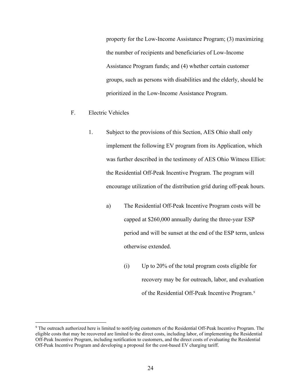 24 property for the Low-Income Assistance Program; (3) maximizing the number of recipients and beneficiaries of Low-Income Assistance Program funds; and (4) whether certain customer groups, such as persons with disabilities and the elderly, should be prioritized in the Low-Income Assistance Program. F. Electric Vehicles 1. Subject to the provisions of this Section, AES Ohio shall only implement the following EV program from its Application, which was further described in the testimony of AES Ohio Witness Elliot: the Residential Off-Peak Incentive Program. The program will encourage utilization of the distribution grid during off-peak hours. a) The Residential Off-Peak Incentive Program costs will be capped at $260,000 annually during the three-year ESP period and will be sunset at the end of the ESP term, unless otherwise extended. (i) Up to 20% of the total program costs eligible for recovery may be for outreach, labor, and evaluation of the Residential Off-Peak Incentive Program.9 9 The outreach authorized here is limited to notifying customers of the Residential Off-Peak Incentive Program. The eligible costs that may be recovered are limited to the direct costs, including labor, of implementing the Residential Off-Peak Incentive Program, including notification to customers, and the direct costs of evaluating the Residential Off-Peak Incentive Program and developing a proposal for the cost-based EV charging tariff.