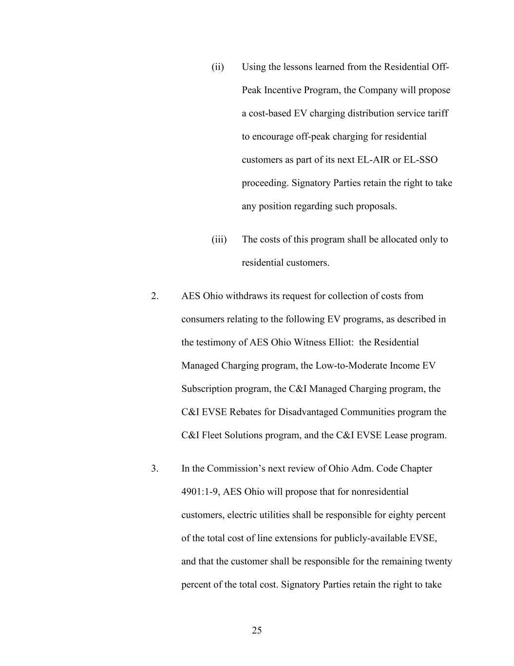 25 (ii) Using the lessons learned from the Residential Off- Peak Incentive Program, the Company will propose a cost-based EV charging distribution service tariff to encourage off-peak charging for residential customers as part of its next EL-AIR or EL-SSO proceeding. Signatory Parties retain the right to take any position regarding such proposals. (iii) The costs of this program shall be allocated only to residential customers. 2. AES Ohio withdraws its request for collection of costs from consumers relating to the following EV programs, as described in the testimony of AES Ohio Witness Elliot: the Residential Managed Charging program, the Low-to-Moderate Income EV Subscription program, the C&I Managed Charging program, the C&I EVSE Rebates for Disadvantaged Communities program the C&I Fleet Solutions program, and the C&I EVSE Lease program. 3. In the Commission’s next review of Ohio Adm. Code Chapter 4901:1-9, AES Ohio will propose that for nonresidential customers, electric utilities shall be responsible for eighty percent of the total cost of line extensions for publicly-available EVSE, and that the customer shall be responsible for the remaining twenty percent of the total cost. Signatory Parties retain the right to take