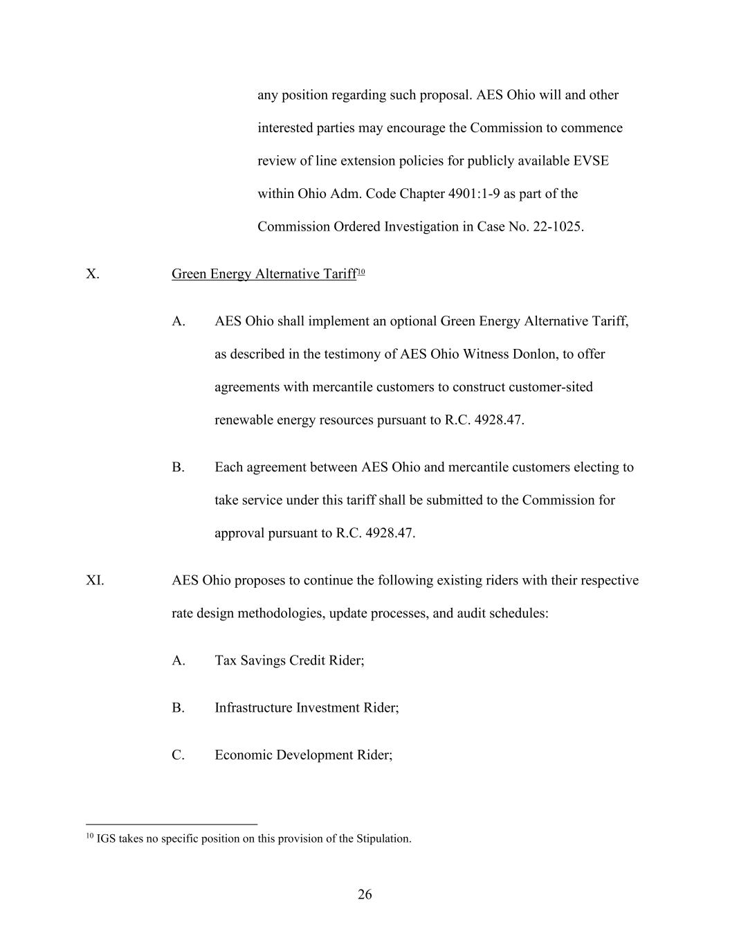 26 any position regarding such proposal. AES Ohio will and other interested parties may encourage the Commission to commence review of line extension policies for publicly available EVSE within Ohio Adm. Code Chapter 4901:1-9 as part of the Commission Ordered Investigation in Case No. 22-1025. X. Green Energy Alternative Tariff10 A. AES Ohio shall implement an optional Green Energy Alternative Tariff, as described in the testimony of AES Ohio Witness Donlon, to offer agreements with mercantile customers to construct customer-sited renewable energy resources pursuant to R.C. 4928.47. B. Each agreement between AES Ohio and mercantile customers electing to take service under this tariff shall be submitted to the Commission for approval pursuant to R.C. 4928.47. XI. AES Ohio proposes to continue the following existing riders with their respective rate design methodologies, update processes, and audit schedules: A. Tax Savings Credit Rider; B. Infrastructure Investment Rider; C. Economic Development Rider; 10 IGS takes no specific position on this provision of the Stipulation.