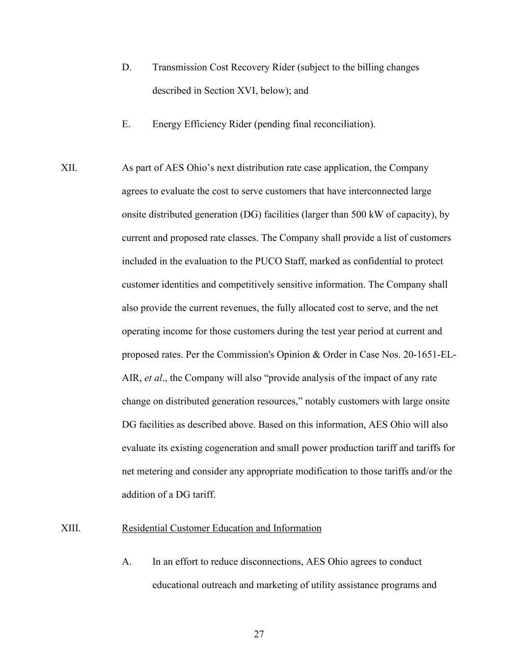 27 D. Transmission Cost Recovery Rider (subject to the billing changes described in Section XVI, below); and E. Energy Efficiency Rider (pending final reconciliation). XII. As part of AES Ohio’s next distribution rate case application, the Company agrees to evaluate the cost to serve customers that have interconnected large onsite distributed generation (DG) facilities (larger than 500 kW of capacity), by current and proposed rate classes. The Company shall provide a list of customers included in the evaluation to the PUCO Staff, marked as confidential to protect customer identities and competitively sensitive information. The Company shall also provide the current revenues, the fully allocated cost to serve, and the net operating income for those customers during the test year period at current and proposed rates. Per the Commission's Opinion & Order in Case Nos. 20-1651-EL- AIR, et al., the Company will also “provide analysis of the impact of any rate change on distributed generation resources,” notably customers with large onsite DG facilities as described above. Based on this information, AES Ohio will also evaluate its existing cogeneration and small power production tariff and tariffs for net metering and consider any appropriate modification to those tariffs and/or the addition of a DG tariff. XIII. Residential Customer Education and Information A. In an effort to reduce disconnections, AES Ohio agrees to conduct educational outreach and marketing of utility assistance programs and
