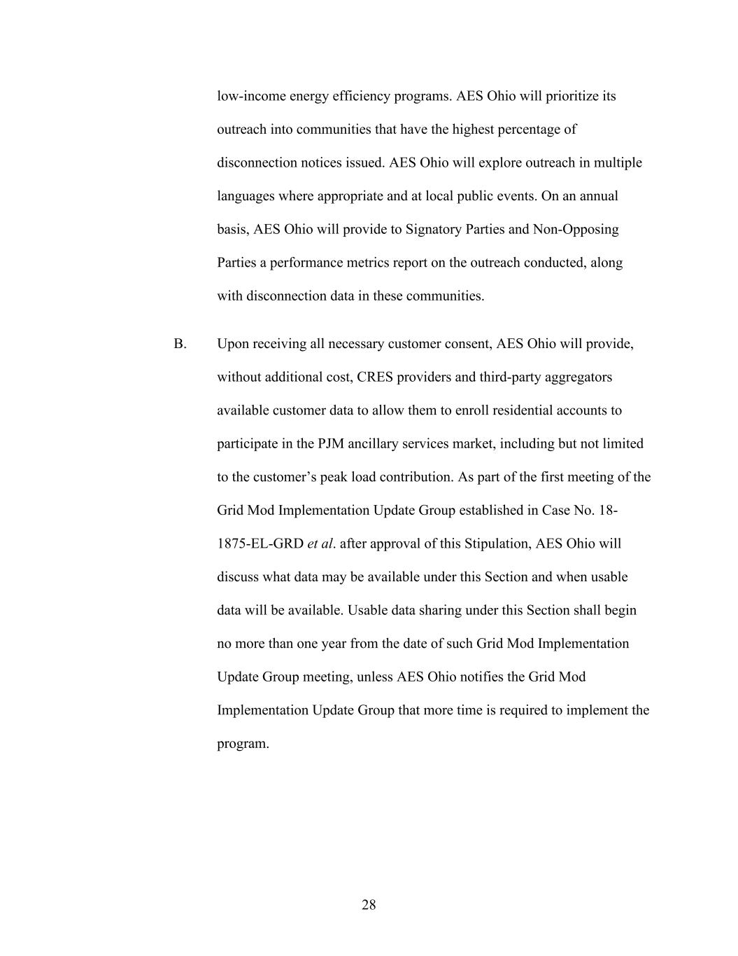 28 low-income energy efficiency programs. AES Ohio will prioritize its outreach into communities that have the highest percentage of disconnection notices issued. AES Ohio will explore outreach in multiple languages where appropriate and at local public events. On an annual basis, AES Ohio will provide to Signatory Parties and Non-Opposing Parties a performance metrics report on the outreach conducted, along with disconnection data in these communities. B. Upon receiving all necessary customer consent, AES Ohio will provide, without additional cost, CRES providers and third-party aggregators available customer data to allow them to enroll residential accounts to participate in the PJM ancillary services market, including but not limited to the customer’s peak load contribution. As part of the first meeting of the Grid Mod Implementation Update Group established in Case No. 18- 1875-EL-GRD et al. after approval of this Stipulation, AES Ohio will discuss what data may be available under this Section and when usable data will be available. Usable data sharing under this Section shall begin no more than one year from the date of such Grid Mod Implementation Update Group meeting, unless AES Ohio notifies the Grid Mod Implementation Update Group that more time is required to implement the program.