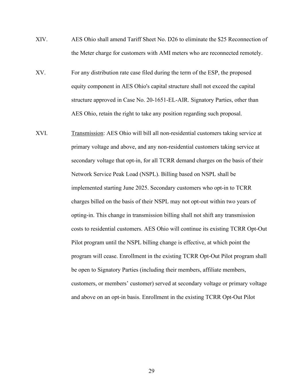 29 XIV. AES Ohio shall amend Tariff Sheet No. D26 to eliminate the $25 Reconnection of the Meter charge for customers with AMI meters who are reconnected remotely. XV. For any distribution rate case filed during the term of the ESP, the proposed equity component in AES Ohio's capital structure shall not exceed the capital structure approved in Case No. 20-1651-EL-AIR. Signatory Parties, other than AES Ohio, retain the right to take any position regarding such proposal. XVI. Transmission: AES Ohio will bill all non-residential customers taking service at primary voltage and above, and any non-residential customers taking service at secondary voltage that opt-in, for all TCRR demand charges on the basis of their Network Service Peak Load (NSPL). Billing based on NSPL shall be implemented starting June 2025. Secondary customers who opt-in to TCRR charges billed on the basis of their NSPL may not opt-out within two years of opting-in. This change in transmission billing shall not shift any transmission costs to residential customers. AES Ohio will continue its existing TCRR Opt-Out Pilot program until the NSPL billing change is effective, at which point the program will cease. Enrollment in the existing TCRR Opt-Out Pilot program shall be open to Signatory Parties (including their members, affiliate members, customers, or members’ customer) served at secondary voltage or primary voltage and above on an opt-in basis. Enrollment in the existing TCRR Opt-Out Pilot