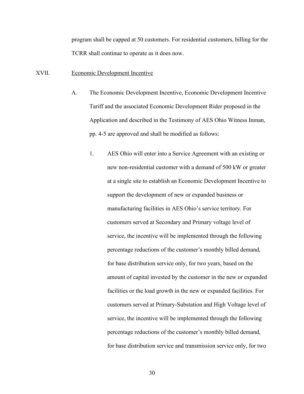 30 program shall be capped at 50 customers. For residential customers, billing for the TCRR shall continue to operate as it does now. XVII. Economic Development Incentive A. The Economic Development Incentive, Economic Development Incentive Tariff and the associated Economic Development Rider proposed in the Application and described in the Testimony of AES Ohio Witness Inman, pp. 4-5 are approved and shall be modified as follows: 1. AES Ohio will enter into a Service Agreement with an existing or new non-residential customer with a demand of 500 kW or greater at a single site to establish an Economic Development Incentive to support the development of new or expanded business or manufacturing facilities in AES Ohio’s service territory. For customers served at Secondary and Primary voltage level of service, the incentive will be implemented through the following percentage reductions of the customer’s monthly billed demand, for base distribution service only, for two years, based on the amount of capital invested by the customer in the new or expanded facilities or the load growth in the new or expanded facilities. For customers served at Primary-Substation and High Voltage level of service, the incentive will be implemented through the following percentage reductions of the customer’s monthly billed demand, for base distribution service and transmission service only, for two